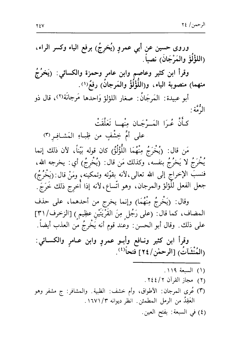 كأنّ عرا المرجان منها تعلّقت على أمّ خشف من ظباء المشافر «3» من قال: يخرج منهما اللؤلؤ كان قوله بيّنا، لأن ذلك إنما يخرج لا يخرج بنفسه، وكذلك من قال: يخرج* أي: يخرجه الله، فنسب الإخراج إلى الله تعالى، لأنه بقوّته وتمكينه، ومن قال: يخرج جعل الفعل للؤلؤ والمرجان، وهو اتّساع، لأنه إذا أخرج ذلك خرج.