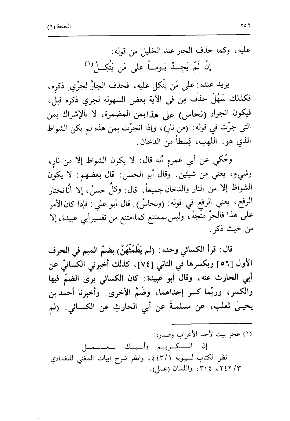 إن لم يجد يوما على من يتّكل «1» يريد عنده: على من يتّكل عليه، فحذف الجارّ لجري ذكره، فكذلك سهل حذف من في الآية بعض السهولة لجري ذكره قبل، فيكون انجرار نحاس على هذا بمن المضمرة، لا بالإشراك بمن التي جرّت في قوله: من نار، وإذا انجرّت بمن هذه لم يكن الشواظ الذي هو: اللهب، قسطا من الدخان.