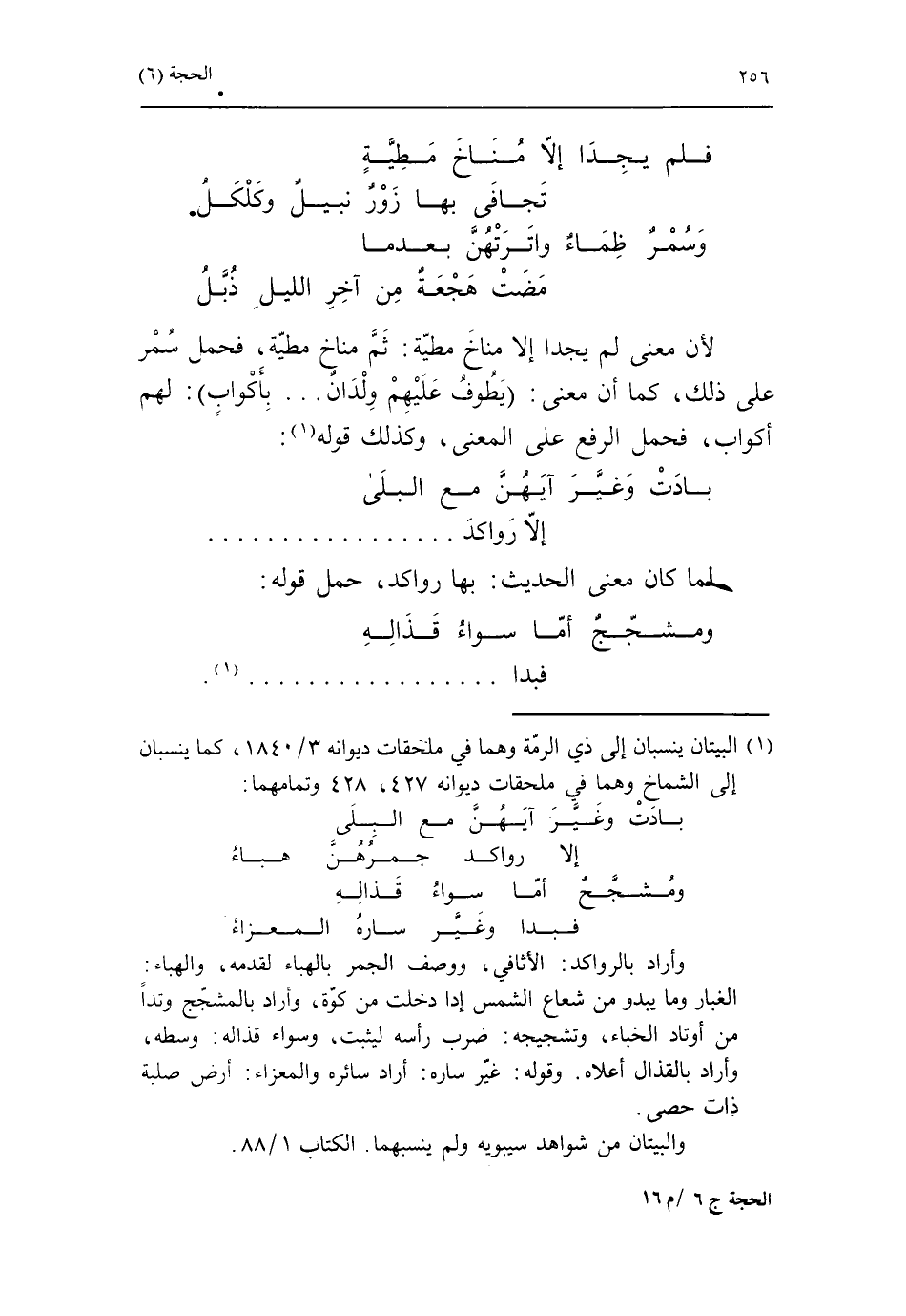 بادت وغيّر ايهنّ مع البلى إلا رواكد جمرهن هباء ومشجّح أمّا سواء قذاله فبدا وغيّر ساره المعزاء وأراد بالرواكد: الأثافي، ووصف الجمر بالهباء لقدمه، والهباء: