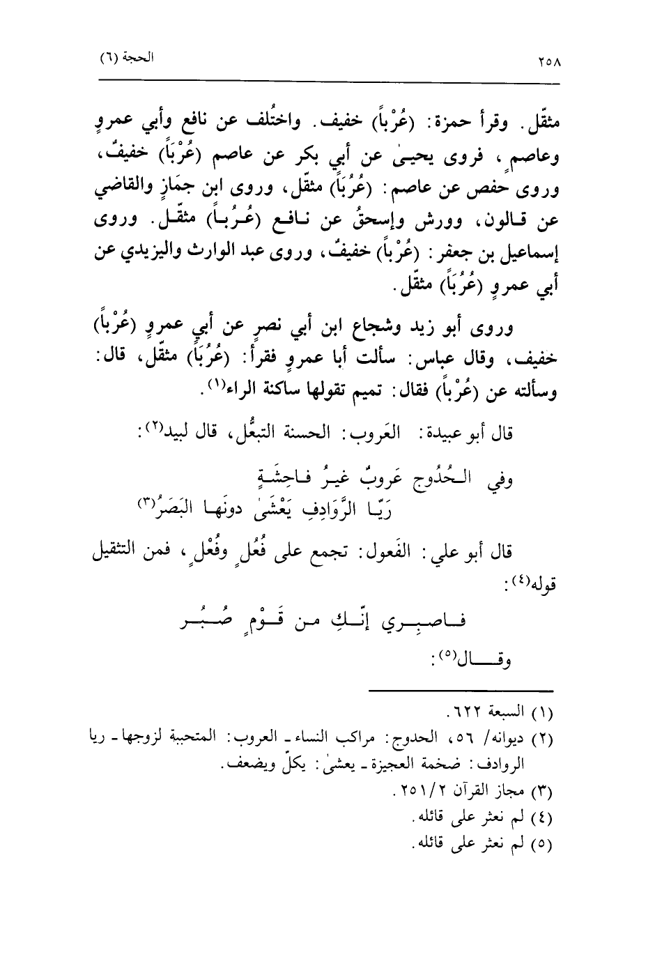 وروى أبو زيد وشجاع ابن أبي نصر عن أبي عمرو عربا خفيف، وقال عباس: سألت أبا عمرو فقرأ: عربا مثقّل، قال: