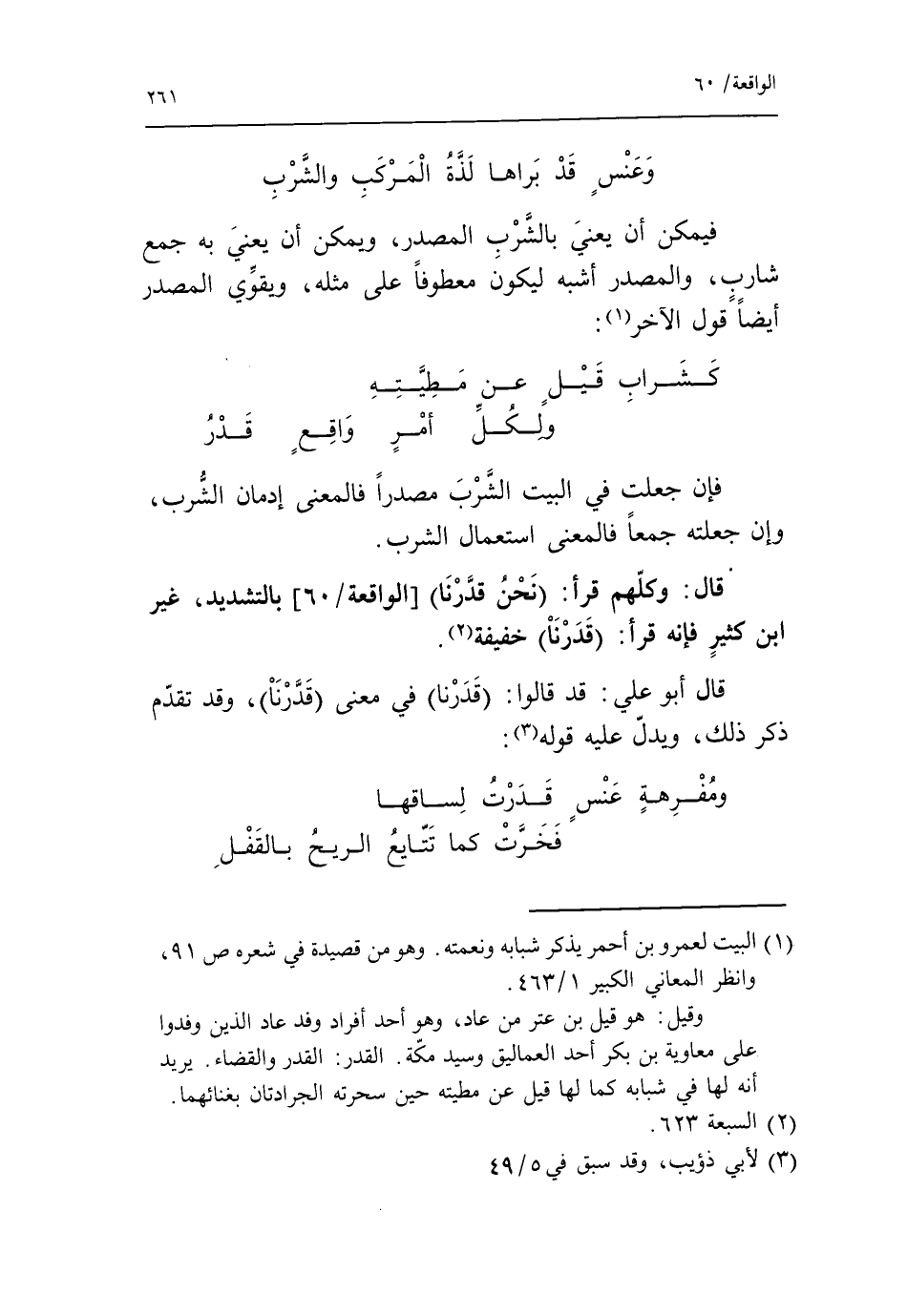 قال: وكلّهم قرأ: نحن قدرنا [الواقعة/ 60] بالتشديد، غير ابن كثير فإنه قرأ: قدرنا* خفيفة «2».