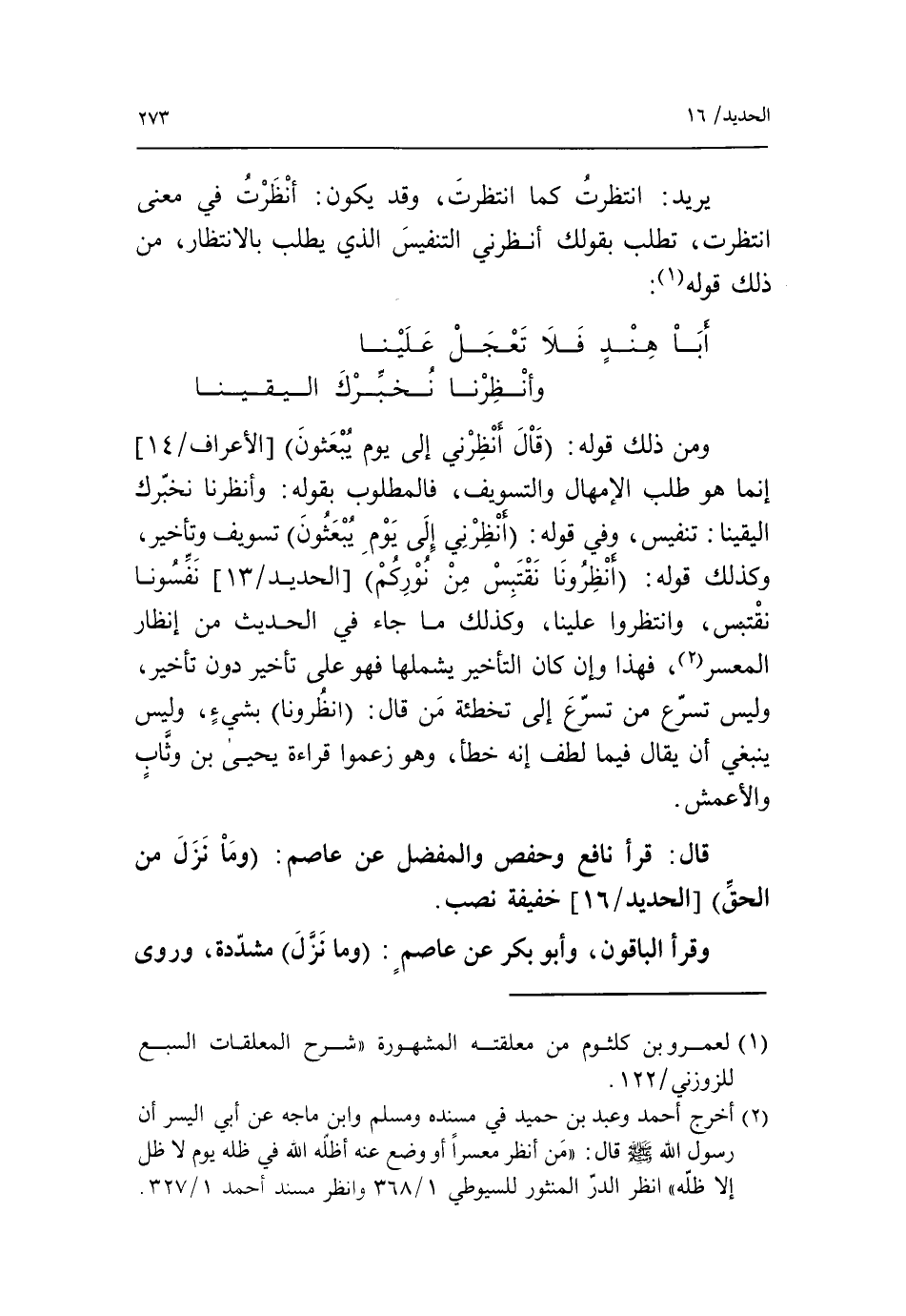 أبا هند فلا تعجل علينا وأنظرنا نخبّرك اليقينا ومن ذلك قوله: قال أنظرني إلى يوم يبعثون [الأعراف/ 14] إنما هو طلب الإمهال والتسويف، فالمطلوب بقوله: وأنظرنا نخبّرك اليقينا: تنفيس، وفي قوله: أنظرني إلى يوم يبعثون تسويف وتأخير، وكذلك قوله: انظرونا نقتبس من نوركم [الحديد/ 13] نفّسونا نقتبس، وانتظروا علينا، وكذلك ما جاء في الحديث من إنظار المعسر «2»، فهذا وإن كان التأخير يشملها فهو على تأخير دون تأخير، وليس تسرّع من تسرع إلى تخطئة من قال: انظرونا بشيء، وليس ينبغي أن يقال فيما لطف إنه خطأ، وهو زعموا قراءة يحيى بن وثّاب والأعمش.