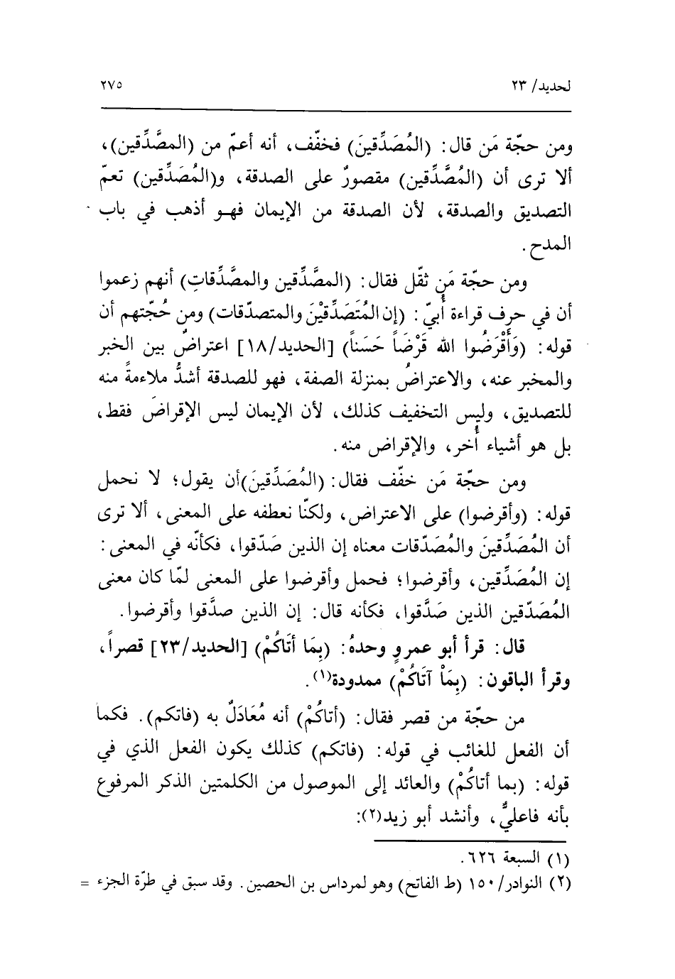 ومن حجّة من قال: المصدقين* فخفّف، أنه أعمّ من المصدقين، ألا ترى أن المصدقين مقصور على الصدقة، والمصدقين* تعمّ التصديق والصادقة، لأن الصدقة من الإيمان فهو أذهب في باب المدح.