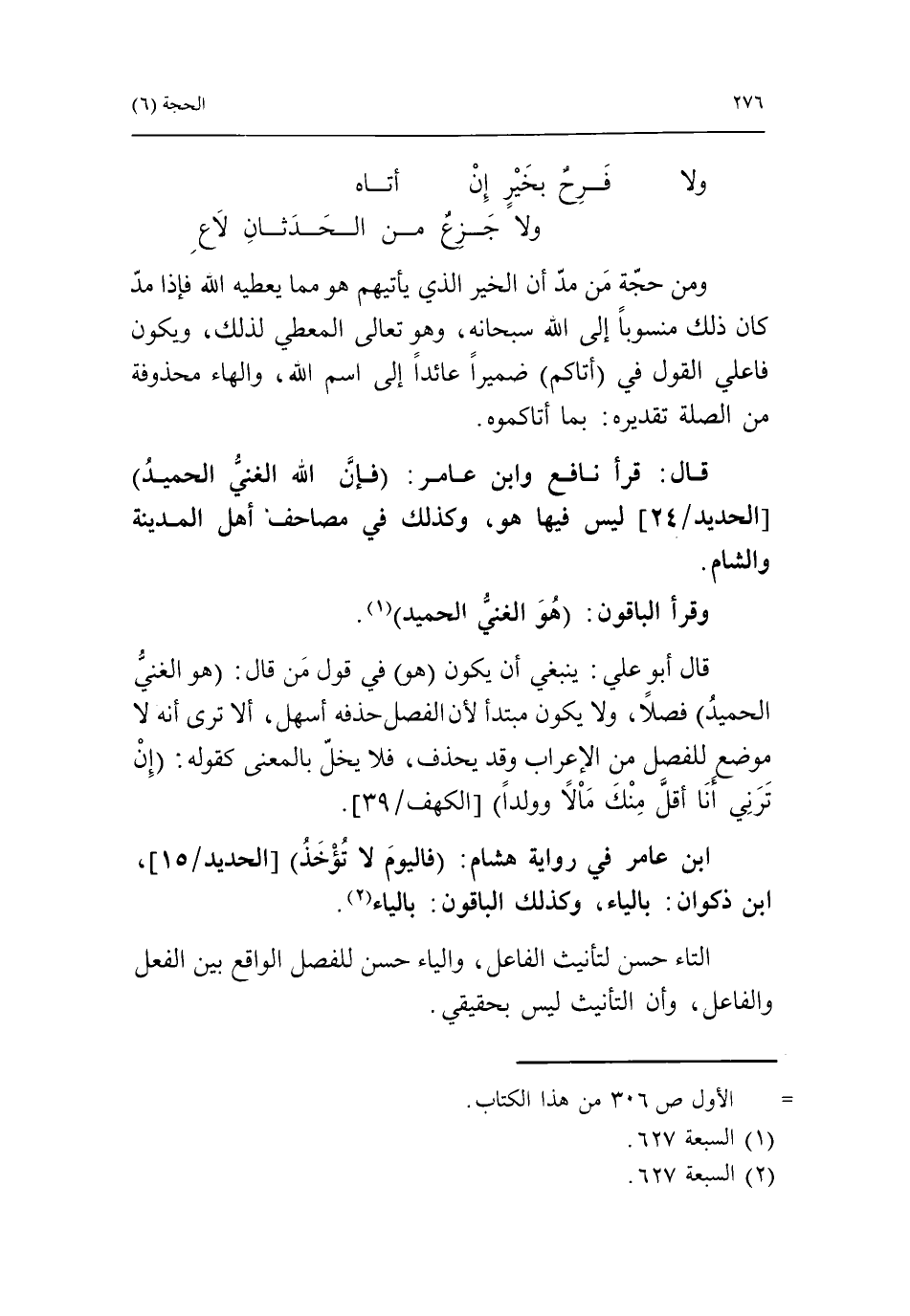 قال أبو علي: ينبغي أن يكون هو* في قول من قال: هو الغني الحميد فصلا، ولا يكون مبتدأ لأن الفصل حذفه أسهل، ألا ترى أنه لا موضع للفصل من الإعراب وقد يحذف، فلا يخلّ بالمعنى كقوله: إن ترني أنا أقل منك مالا وولدا [الكهف/ 39].