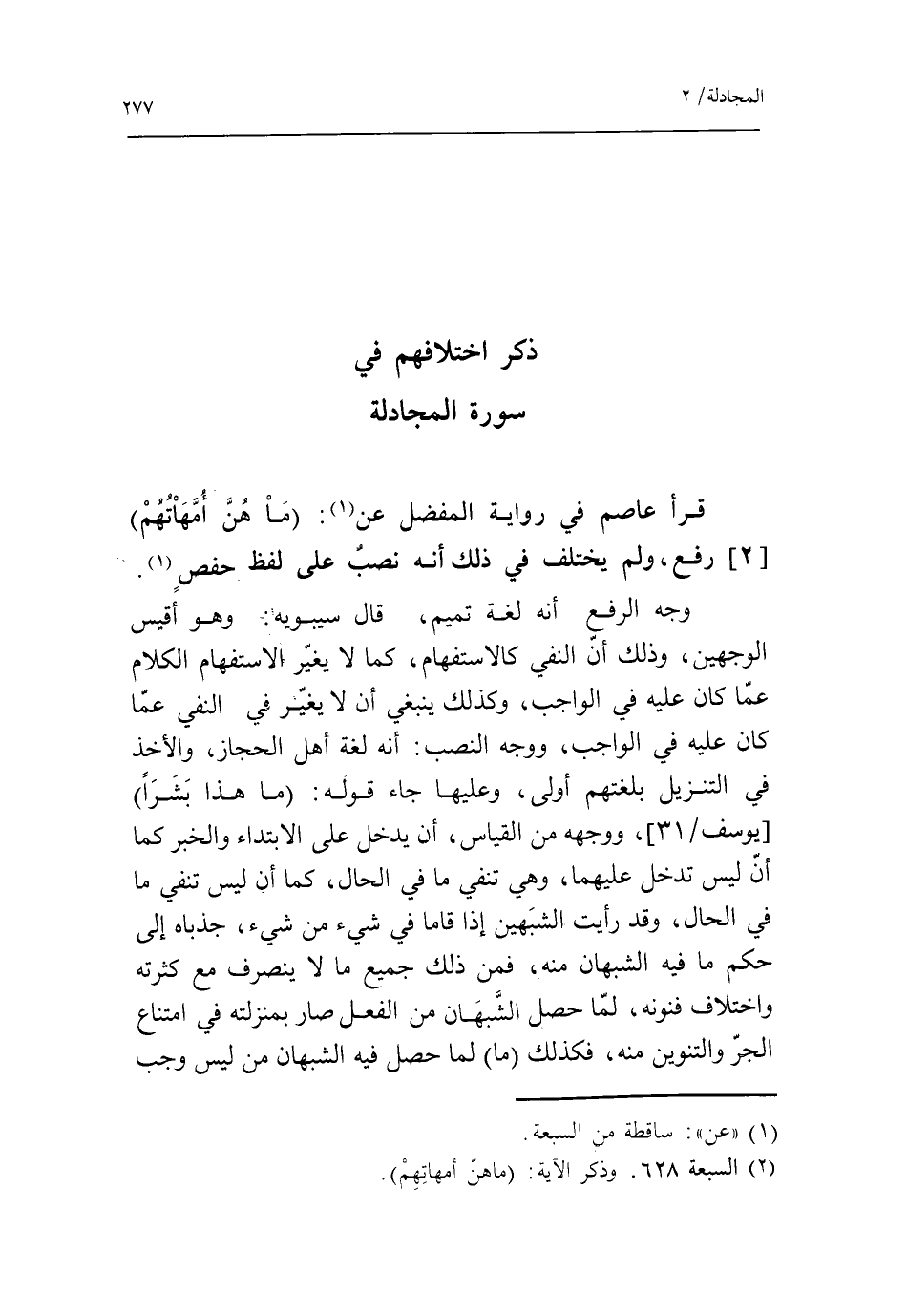 (2) السبعة 628. وذكر الآية: (ما هنّ أمهاتهم).