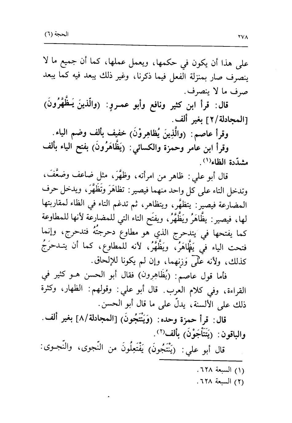 فأما قول عاصم: يظاهرون فقال أبو الحسن هو كثير في القراءة، وفي كلام العرب. قال أبو علي: وقولهم: الظهار، وكثرة ذلك على الألسنة، يدلّ على ما قال أبو الحسن.