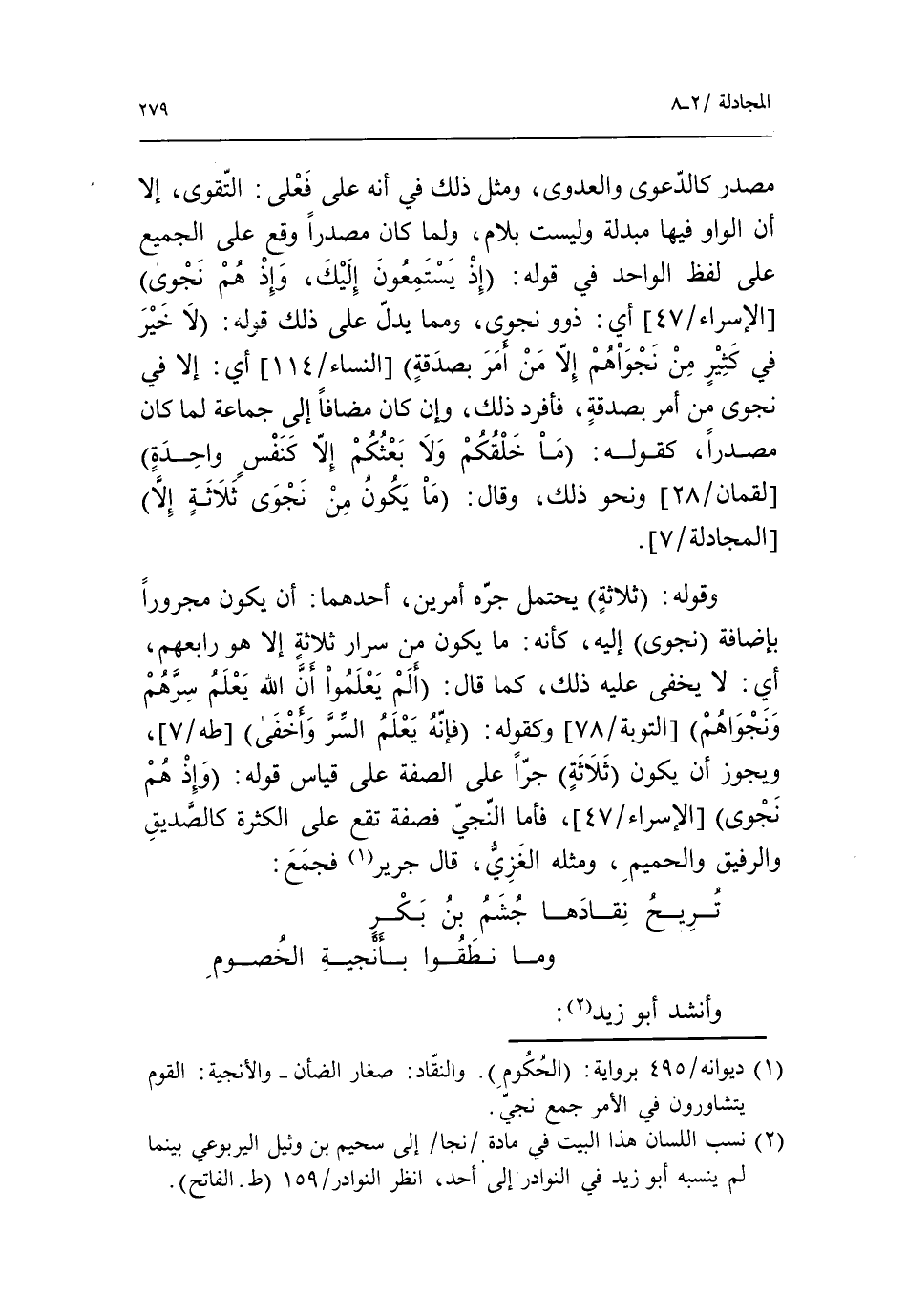 وقوله: ثلاثة يحتمل جرّه أمرين، أحدهما: أن يكون مجرورا بإضافة نجوى إليه، كأنه: ما يكون من سرار ثلاثة إلا هو رابعهم، أي: لا يخفى عليه ذلك، كما قال: ألم يعلموا أن الله يعلم سرهم ونجواهم [التوبة/ 78] وكقوله: فإنه يعلم السر وأخفى [طه/ 7]، ويجوز أن يكون ثلاثة جرّا على الصفة على قياس قوله: وإذ هم نجوى [الإسراء/ 47]، فأما النّجيّ فصفة تقع على الكثرة كالصّديق والرفيق والحميم، ومثله الغزي، قال جرير «1» فجمع: