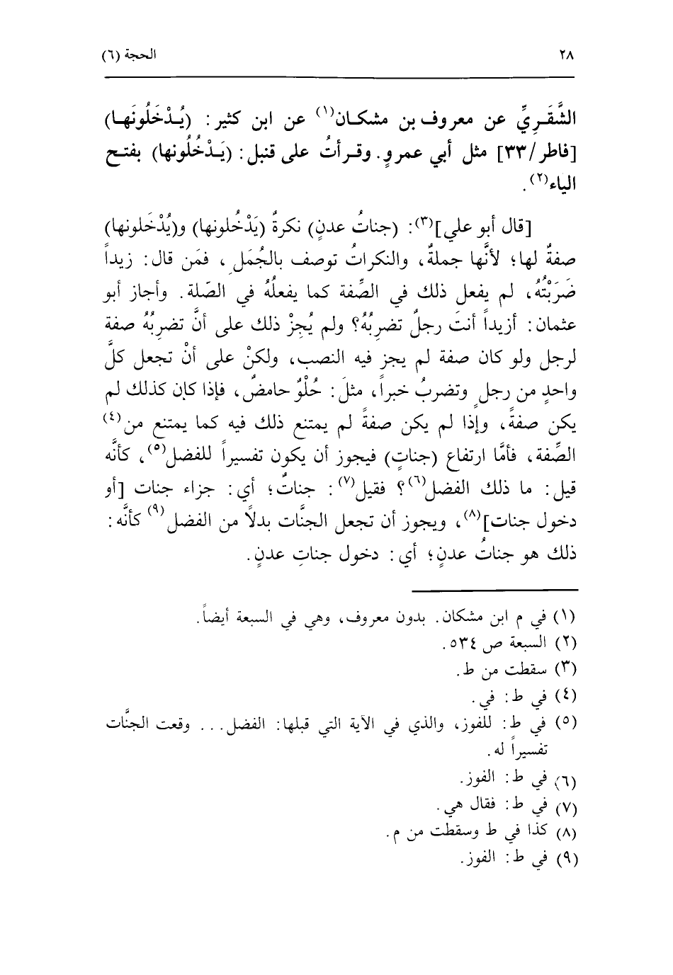 الشّقريّ عن معروف بن مشكان «1» عن ابن كثير: يدخلونها* [فاطر/ 33] مثل أبي عمرو. وقرأت على قنبل: يدخلونها بفتح الياء «2».