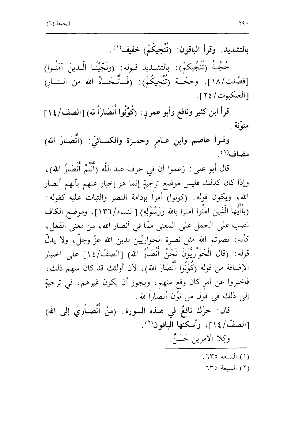 حجّة تنجيكم: بالتشديد قوله: ونجينا الذين آمنوا [فصّلت/ 18]. وحجة تنجيكم: فأنجاه الله من النار [العنكبوت/ 24].