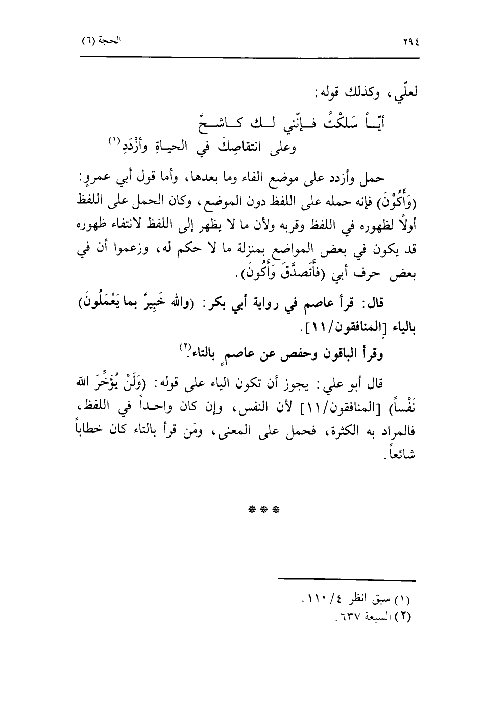 وأكون فإنه حمله على اللفظ دون الموضع، وكان الحمل على اللفظ أولا لظهوره في اللفظ وقربه ولأن ما لا يظهر إلى اللفظ لانتفاء ظهوره قد يكون في بعض المواضع بمنزلة ما لا حكم له، وزعموا أن في بعض حرف أبي فأتصدق وأكون.