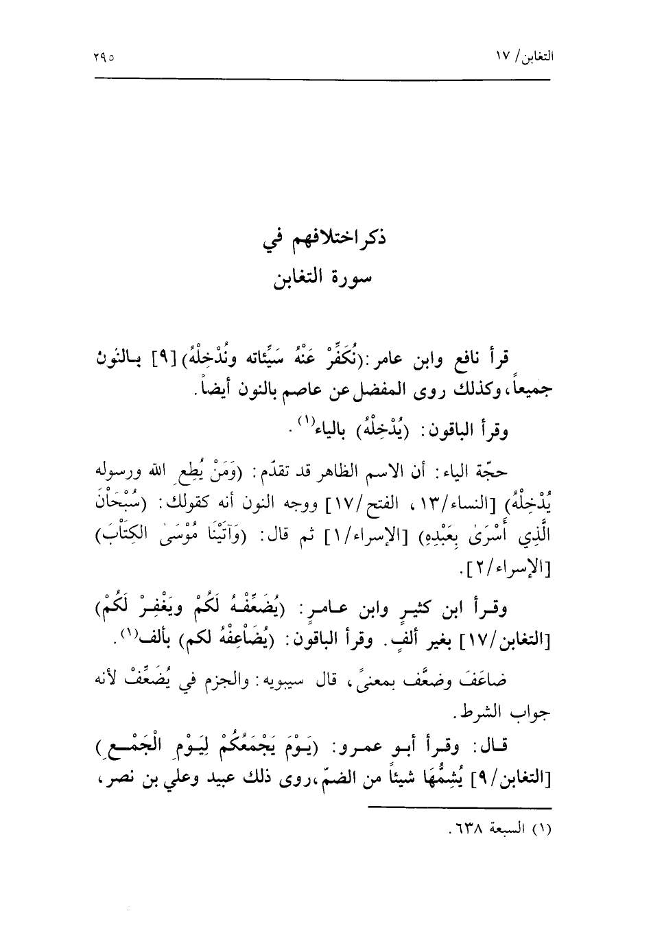 وقرأ ابن كثير وابن عامر: يضعفه لكم ويغفر لكم [التغابن/ 17] بغير ألف. وقرأ الباقون: يضاعفه لكم بألف «1».