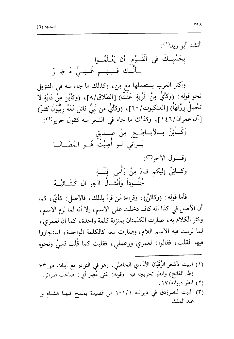 بحسبك في القوم أن يعلموا بأنّك فيهم غنيّ مضرّ وأكثر العرب يستعملها مع من، وكذلك ما جاء منه في التنزيل نحو قوله: وكأي من قرية عتت [الطلاق/ 8]، وكأين من دابة لا تحمل رزقها [العنكبوت/ 60]، وكأي من نبي قاتل معه ربيون كثير [آل عمران/ 146]، وكذلك ما جاء في الشعر منه كقول جرير «2»: