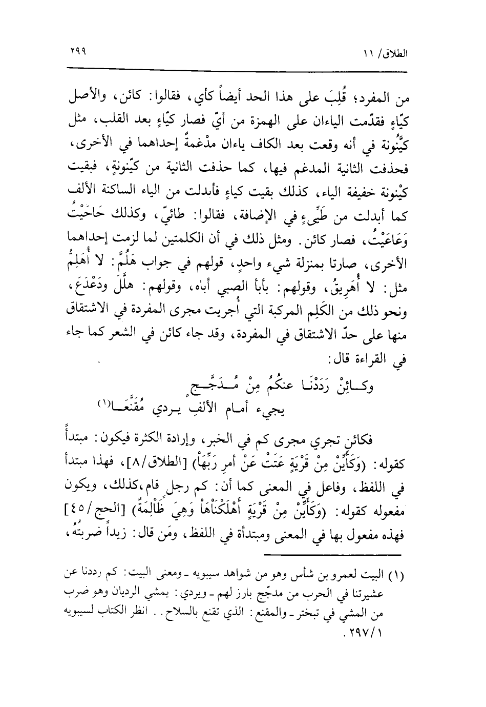 من طيّئ في الإضافة، فقالوا: طائيّ، وكذلك حاحيت وعاعيت، فصار كائن. ومثل ذلك في أن الكلمتين لما لزمت إحداهما الأخرى، صارتا بمنزلة شيء واحد، قولهم في جواب هلمّ: لا أهلمّ مثل: لا أهريق، وقولهم: بأبأ الصبي أباه، وقولهم: هلّل ودعدع، ونحو ذلك من الكلم المركبة التي أجريت مجرى المفردة في الاشتقاق منها على حدّ الاشتقاق في المفردة، وقد جاء كائن في الشعر كما جاء في القراءة قال: