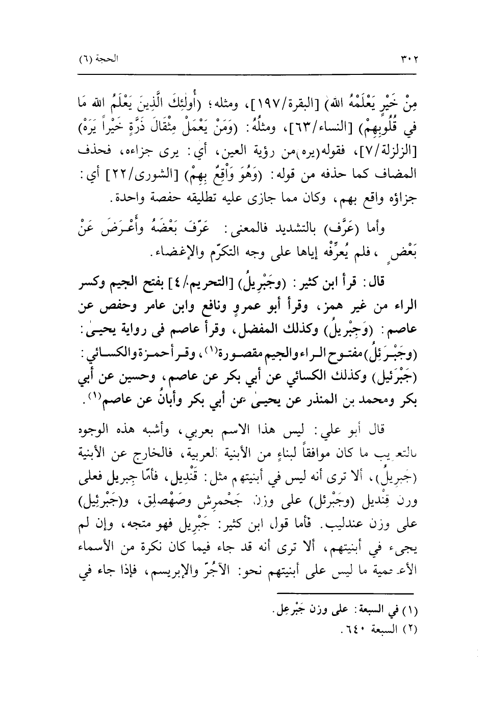 قال أبو علي: ليس هذا الاسم بعربي، وأشبه هذه الوجوه بالتعريب ما كان موافقا لبناء من الأبنية العربية، فالخارج عن الأبنية جبريل*، ألا ترى أنه ليس في أبنيتهم مثل: قنديل، فأمّا جبريل فعلى وزن قنديل وجبرئل* على وزن جحمرش وصهصلق، وجبرئيل على وزن عندليب. فأما قول ابن كثير: جبريل فهو متجه، وإن لم يجيء في أبنيتهم، ألا ترى أنه قد جاء فيما كان نكرة من الأسماء الأعجمية ما ليس على أبنيتهم نحو: الآجرّ والإبريسم، فإذا جاء في
