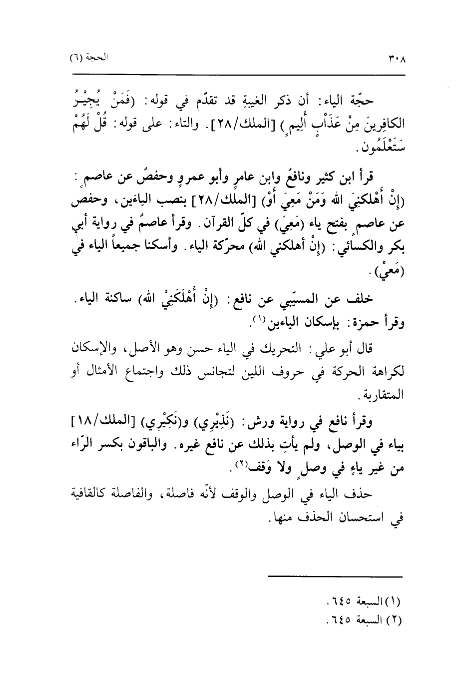 إن أهلكني الله ومن معي أو [الملك/ 28] بنصب الياءين، وحفص عن عاصم بفتح ياء معي في كلّ القرآن. وقرأ عاصم في رواية أبي بكر والكسائي: إن أهلكني الله محرّكة الياء. وأسكنا جميعا الياء في معي*.