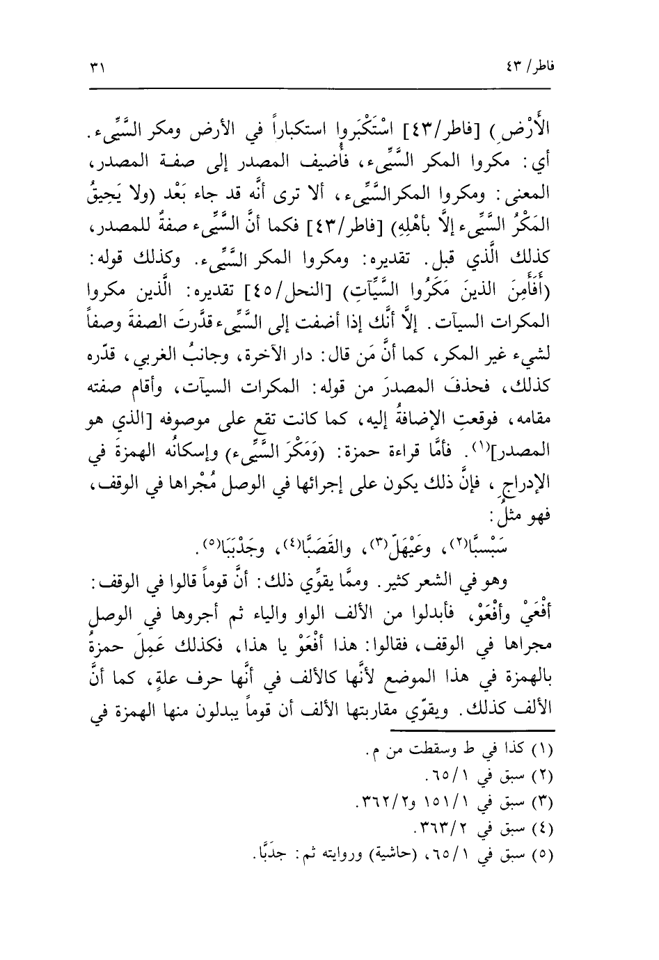 أفأمن الذين مكروا السيآت [النحل/ 45] تقديره: الّذين مكروا المكرات السيئات. إلّا أنّك إذا أضفت إلى السّيّئ قدّرت الصفة وصفا لشيء غير المكر، كما أنّ من قال: دار الآخرة، وجانب الغربي، قدّره كذلك، فحذف المصدر من قوله: المكرات السيئات، وأقام صفته مقامه، فوقعت الإضافة إليه، كما كانت تقع على موصوفه [الذي هو المصدر] «1». فأمّا قراءة حمزة: ومكر السيئ وإسكانه الهمزة في الإدراج، فإنّ ذلك يكون على إجرائها في الوصل مجراها في الوقف، فهو مثل: