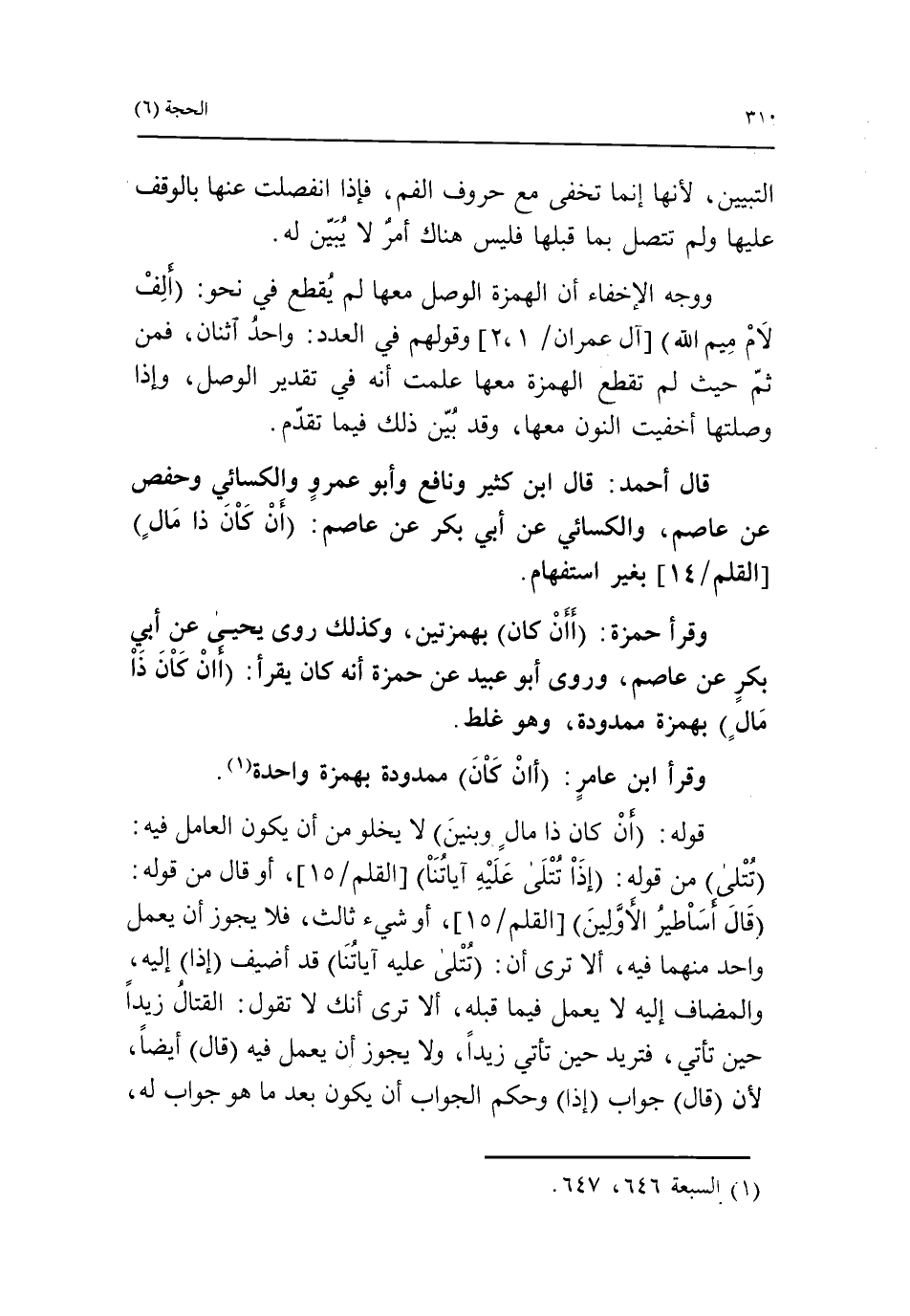 قال أحمد: قال ابن كثير ونافع وأبو عمرو والكسائي وحفص عن عاصم، والكسائي عن أبي بكر عن عاصم: أن كان ذا مال [القلم/ 14] بغير استفهام.