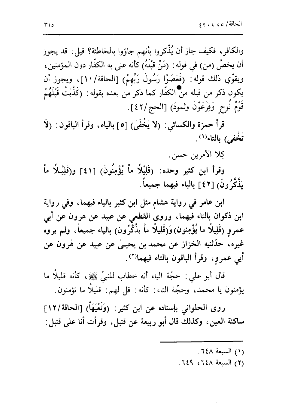 ابن عامر في رواية هشام مثل ابن كثير بالياء فيهما، وفي رواية ابن ذكوان بالتاء فيهما، وروى القطعي عن عبيد عن هارون عن أبي عمرو قليلا ما يؤمنون وقليلا ما يذكرون بالياء جميعا، ولم يروه غيره، حدّثنيه الخزاز عن محمد بن يحيى عن عبيد عن هارون عن أبي عمرو، وقرأ الباقون بالتاء فيهما «2» قال أبو علي: حجّة الياء أنه خطاب للنبيّ صلى اللَّه عليه وآله وسلم، كأنه قليلا ما يؤمنون يا محمد، وحجّة التاء: كأنه: قل لهم: قليلا ما تؤمنون.