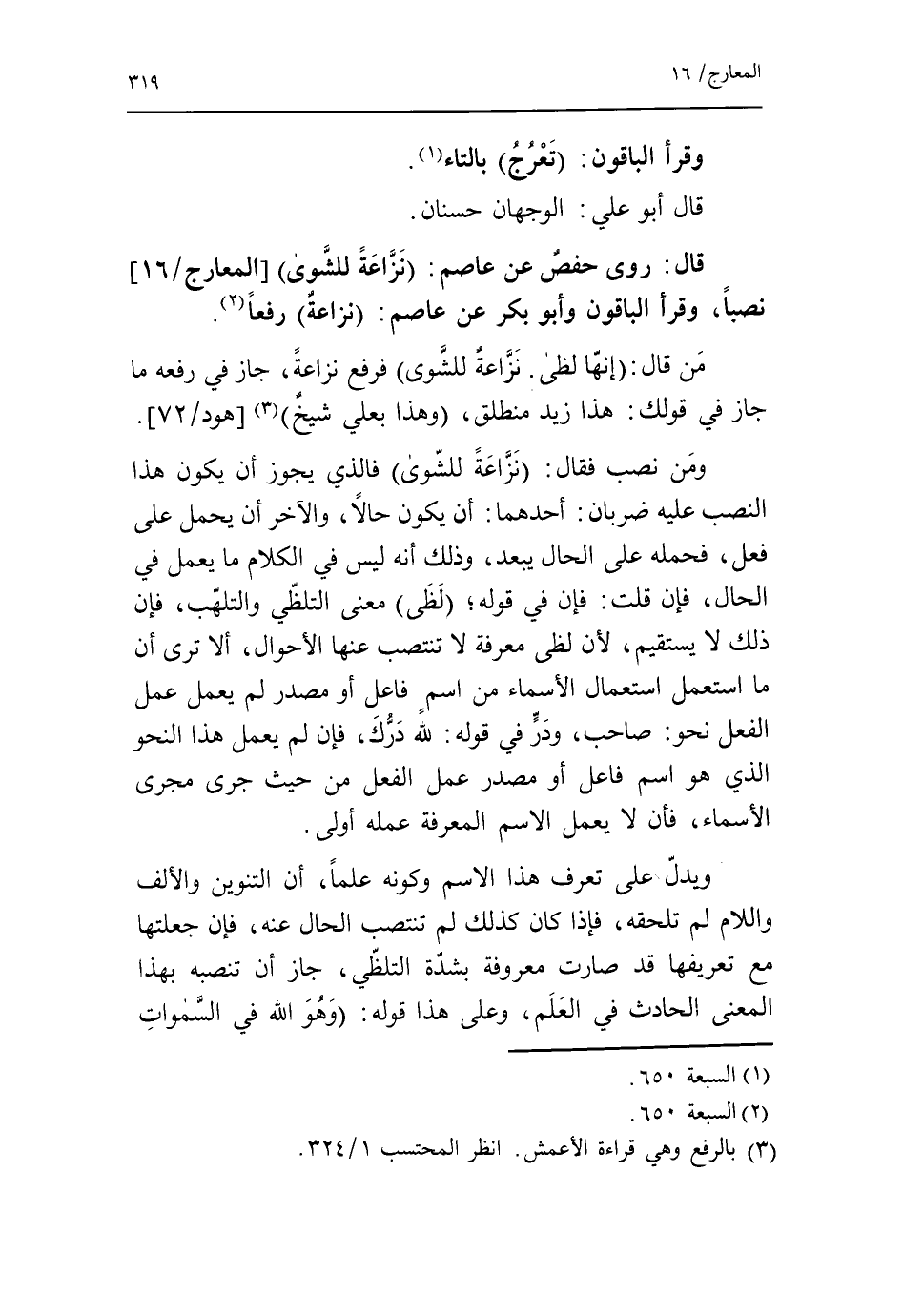 قال: روى حفص عن عاصم: نزاعة للشوى [المعارج/ 16] نصبا، وقرأ الباقون وأبو بكر عن عاصم: نزاعة رفعا «2».