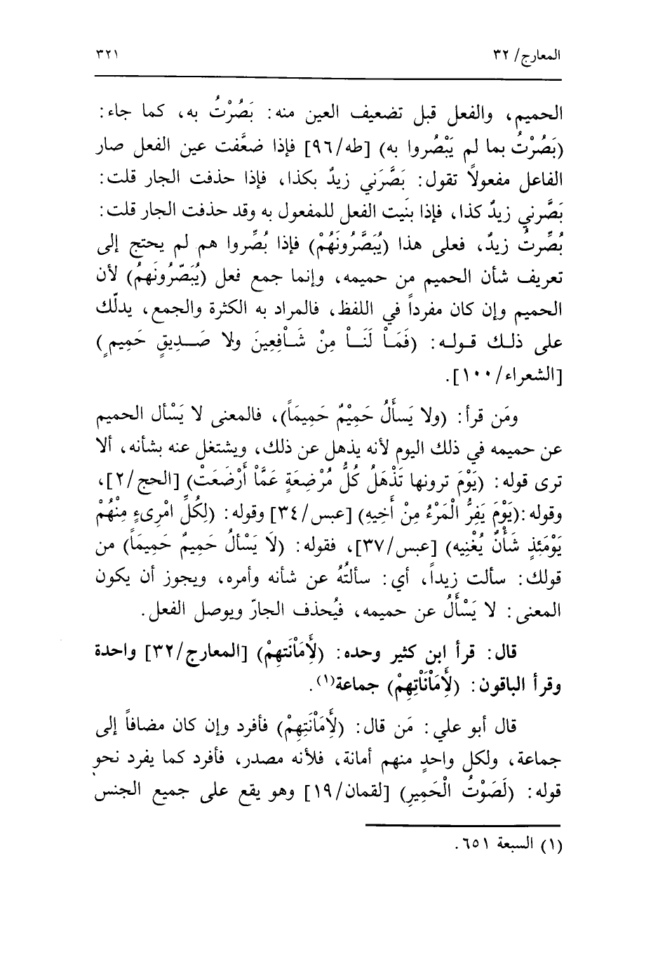 ومن قرأ: ولا يسأل حميم حميما، فالمعنى لا يسأل الحميم عن حميمه في ذلك اليوم لأنه يذهل عن ذلك، ويشتغل عنه بشأنه، ألا ترى قوله: يوم ترونها تذهل كل مرضعة عما أرضعت [الحج/ 2]، وقوله: يوم يفر المرء من أخيه [عبس/ 34] وقوله: لكل امرىء منهم يومئذ شأن يغنيه [عبس/ 37]، فقوله: لا يسأل حميم حميما من قولك: سألت زيدا، أي سألته عن شأنه وأمره، ويجوز أن يكون المعنى: لا يسأل عن حميمه، فيحذف الجارّ ويوصل الفعل.
