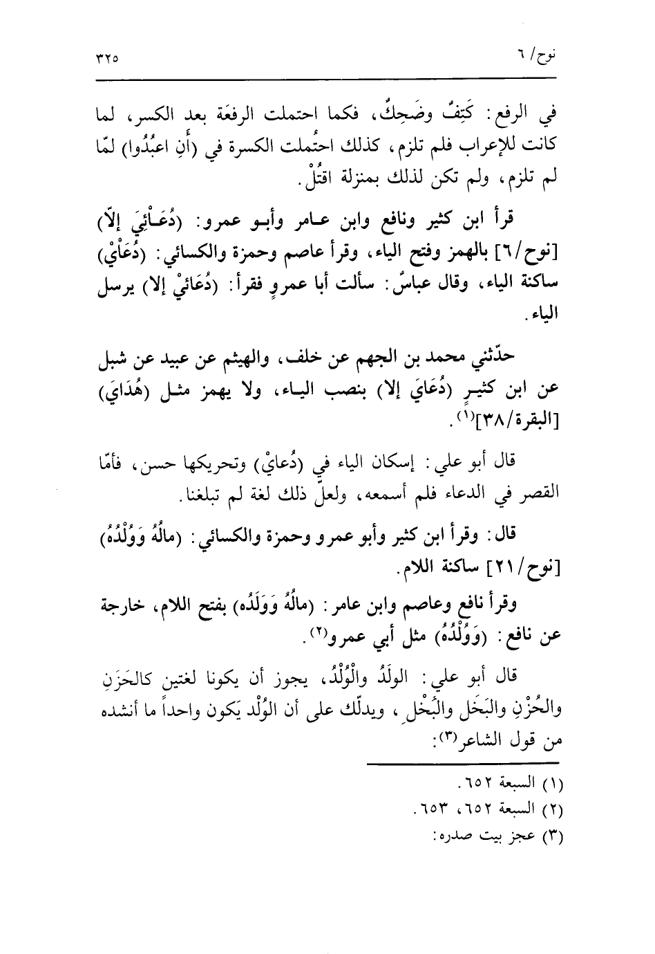 قرأ ابن كثير ونافع وابن عامر وأبو عمرو: دعائي إلا [نوح/ 6] بالهمزة وفتح الياء، وقرأ عاصم وحمزة والكسائي: دعاي ساكنة الياء، وقال عباس: سألت أبا عمرو فقرأ: دعائي إلا يرسل الياء.