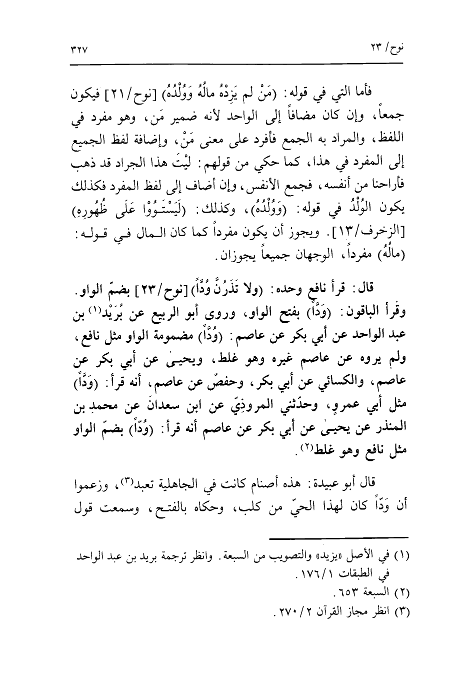 وقرأ الباقون: ودا بفتح الواو، وروى أبو الربيع عن بريد «1» بن عبد الواحد عن أبي بكر عن عاصم: ودا* مضمومة الواو مثل نافع، ولم يروه عن عاصم غيره وهو غلط، ويحيى عن أبي بكر عن عاصم، والكسائي عن أبي بكر، وحفص عن عاصم، أنه قرأ: ودا مثل أبي عمرو، وحدّثني المروذيّ عن ابن سعدان عن محمد بن المنذر عن يحيى عن أبي بكر عن عاصم أنه قرأ: ودا* بضمّ الواو مثل نافع وهو غلط «2».