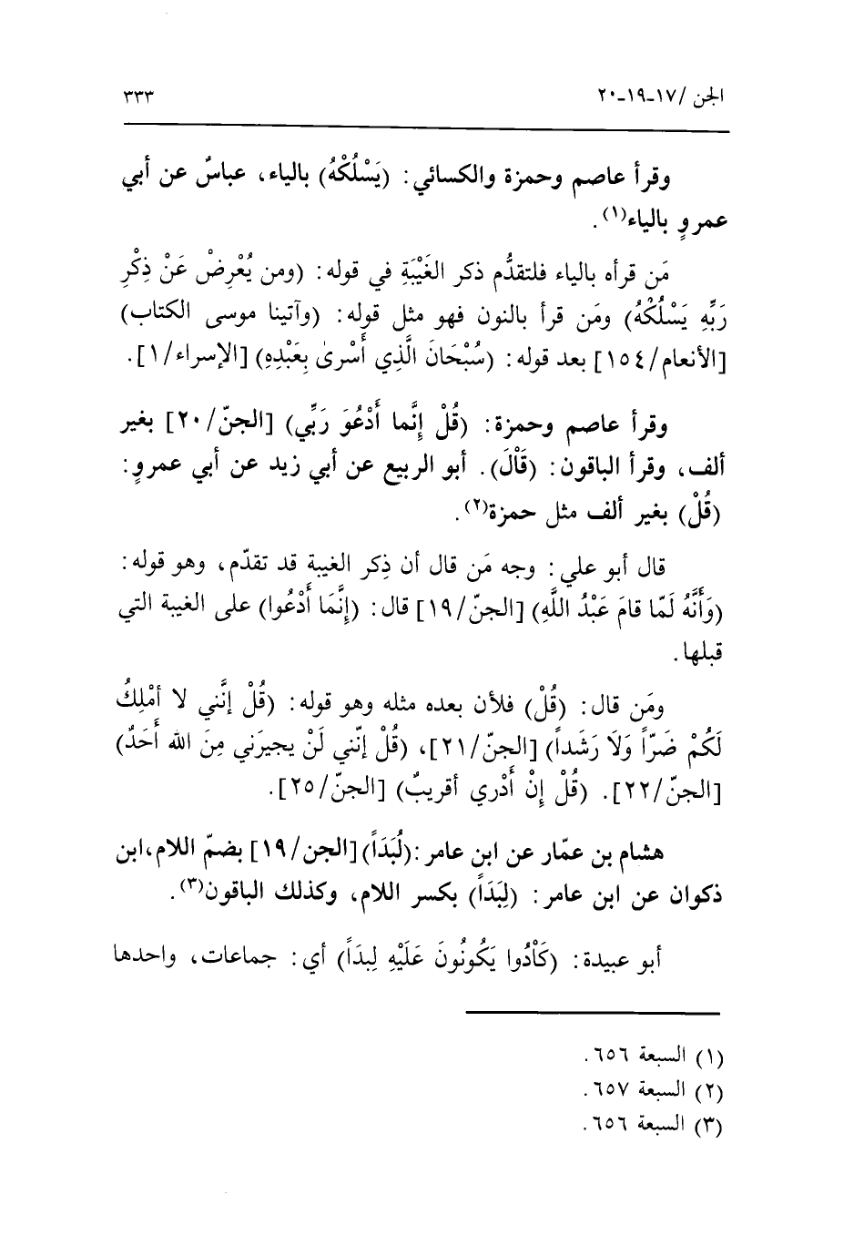 هشام بن عمّار عن ابن عامر: لبدا* [الجن/ 19] بضمّ اللام، ابن ذكوان عن ابن عامر: لبدا بكسر اللام، وكذلك الباقون «3».