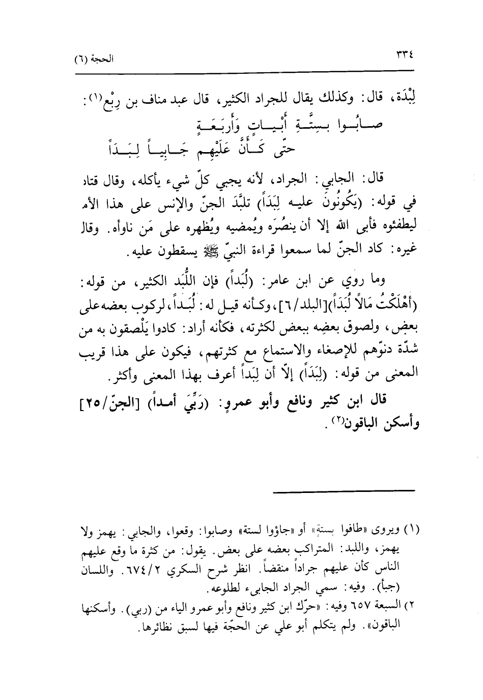 صابوا بستّة أبيات وأربعة حتّى كأنّ عليهم جابيا لبدا قال: الجابي: الجراد، لأنه يجبي كلّ شيء يأكله، وقال قتادة في قوله: يكونون عليه لبدا تلبّد الجن والإنس على هذا الأم ليطفئوه فأبى الله إلا أن ينصره ويمضيه ويظهره على من ناوأه. وقال غيره: كاد الجن لما سمعوا قراءة النبيّ صلى الله عليه وآله وسلم يسقطون عليه. وما روي عن ابن عامر: لبدا* فإن اللّبد الكثير، من قوله: