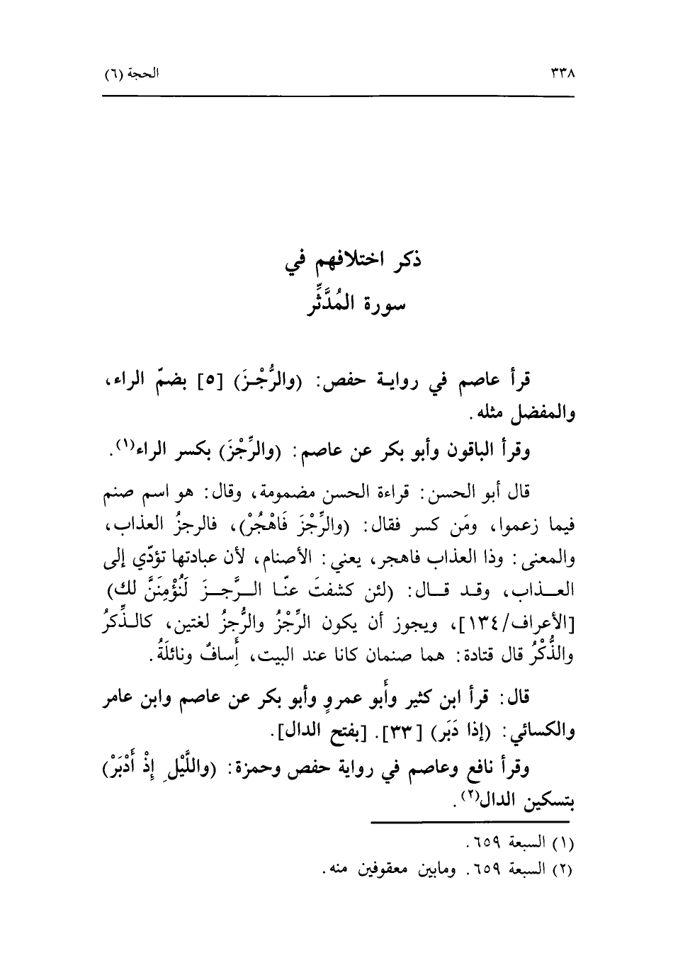 قرأ عاصم في رواية حفص: والرجز [5] بضمّ الراء، والمفضل مثله.