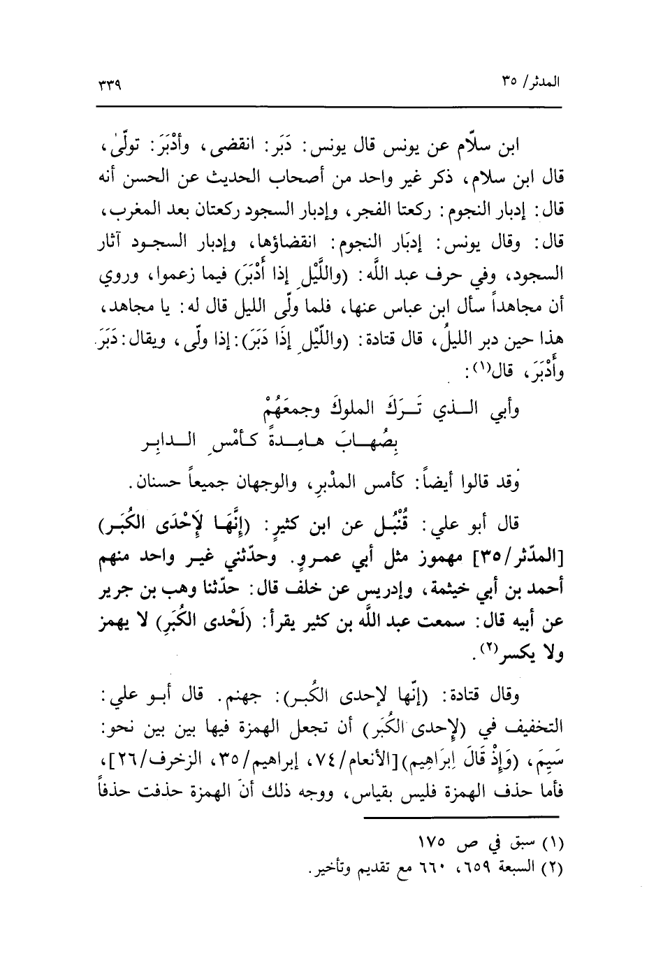 ابن سلّام عن يونس قال يونس: دبر: انقضى، وأدبر: تولّى، قال ابن سلام، ذكر غير واحد من أصحاب الحديث عن الحسن أنه قال: إدبار النجوم: ركعتا الفجر، وإدبار السجود ركعتان بعد المغرب، قال: وقال يونس: إدبار النجوم: انقضاؤها، وإدبار السجود آثار السجود، وفي حرف عبد الله: والليل إذا أدبر فيما زعموا، وروي أن مجاهدا سأل ابن عباس عنها، فلما ولّى الليل قال له: يا مجاهد، هذا حين دبر الليل، قال قتادة: والليل إذا دبر: إذا ولّى، ويقال: دبر.