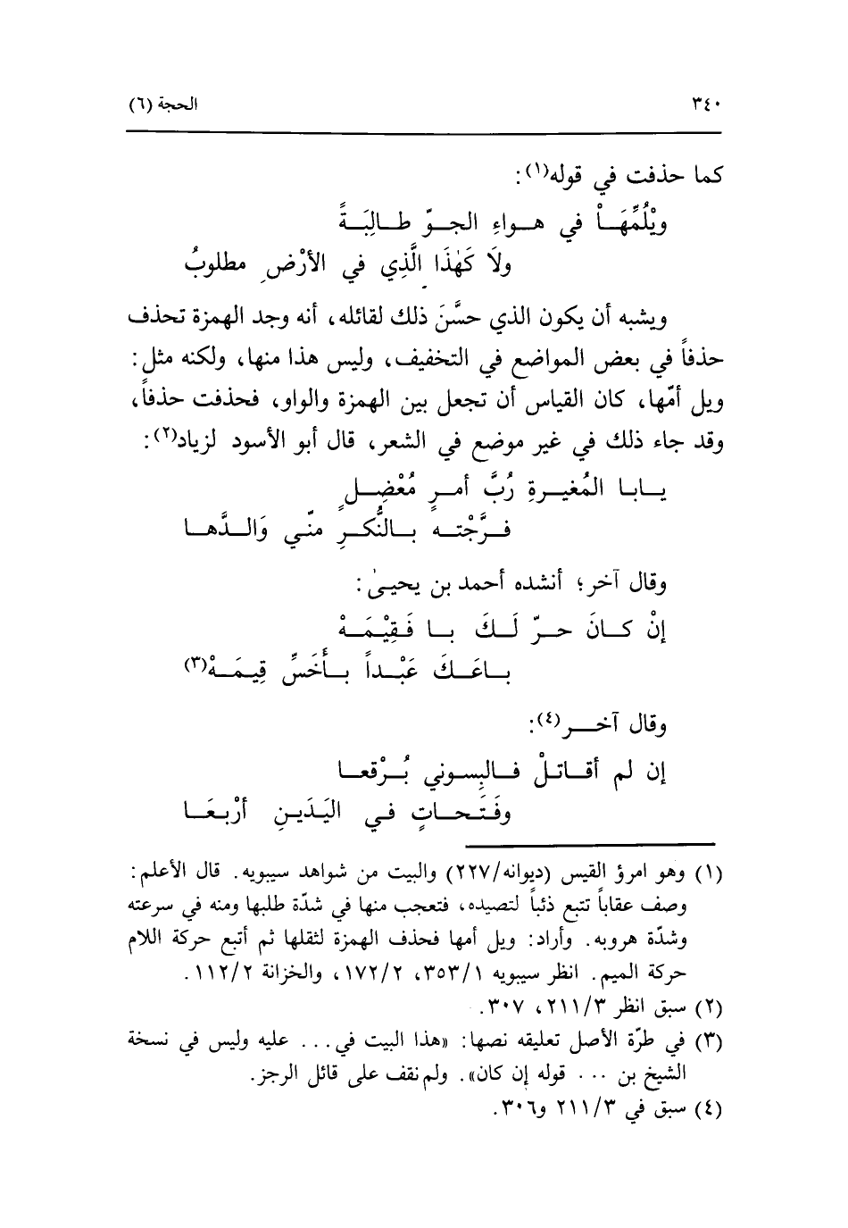 ويلمّها في هواء الجوّ طالبة ولا كهذا الّذي في الأرض مطلوب ويشبه أن يكون الذي حسّن ذلك لقائله، أنه وجد الهمزة تحذف حذفا في بعض المواضع في التخفيف، وليس هذا منها، ولكنه مثل: