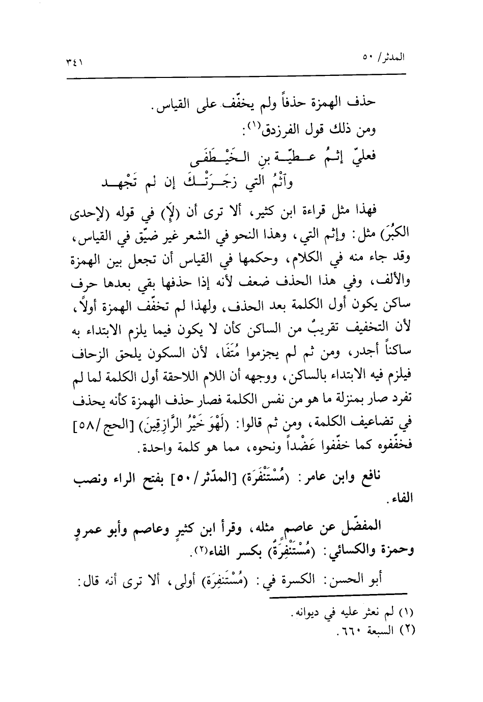 فعليّ إثم عطيّة بن الخيطفى واثم التي زجرتك إن لم تجهد فهذا مثل قراءة ابن كثير، ألا ترى أن لإ* في قوله لإحدى الكبر مثل: وإثم التي، وهذا النحو في الشعر غير ضيّق في القياس، وقد جاء منه في الكلام، وحكمها في القياس أن تجعل بين الهمزة والألف، وفي هذا الحذف ضعف لأنه إذا حذفها بقي بعدها حرف ساكن يكون أول الكلمة بعد الحذف، ولهذا لم يتخفّف الهمزة أولا، لأن التخفيف تقريب من الساكن كأن لا يكون فيما يلزم الابتداء به ساكنا أجدر، ومن ثم لم يجزموا متفا، لأن السكون يلحق الزحاف فيلزم فيه الابتداء بالساكن، ووجهه أن اللام اللاحقة أول الكلمة لما لم تفرد صار بمنزلة ما هو من نفس الكلمة فصار حذف الهمزة كأنه يحذف في تضاعيف الكلمة، ومن ثم قالوا: لهو خير الرازقين [الحج/ 58] فخفّفوه كما خفّفوا عضدا ونحوه، مما هو كلمة واحدة.