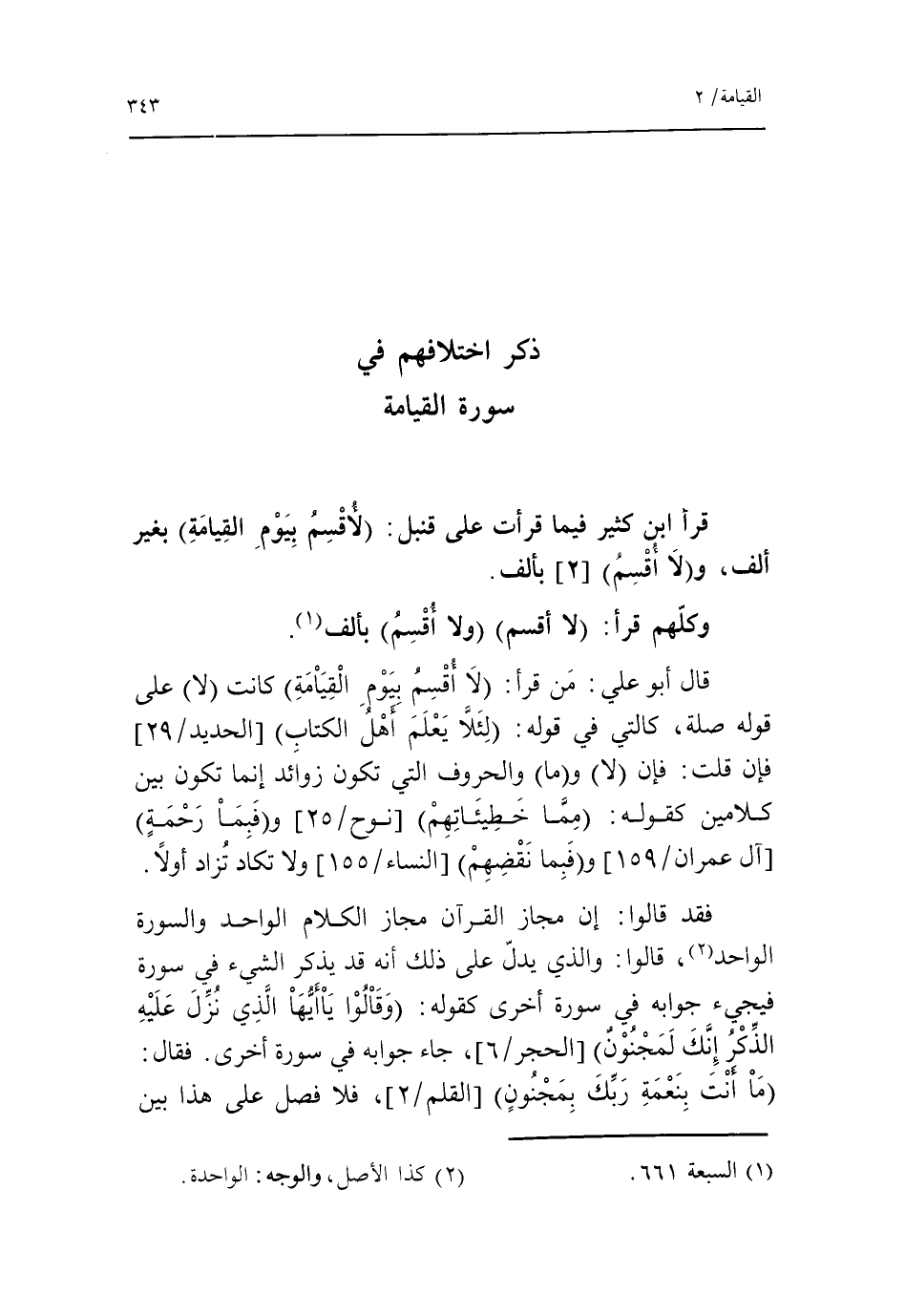 قرأ ابن كثير فيما قرأت على قنبل: لأقسم بيوم القيامة بغير ألف، ولا أقسم [2] بألف.