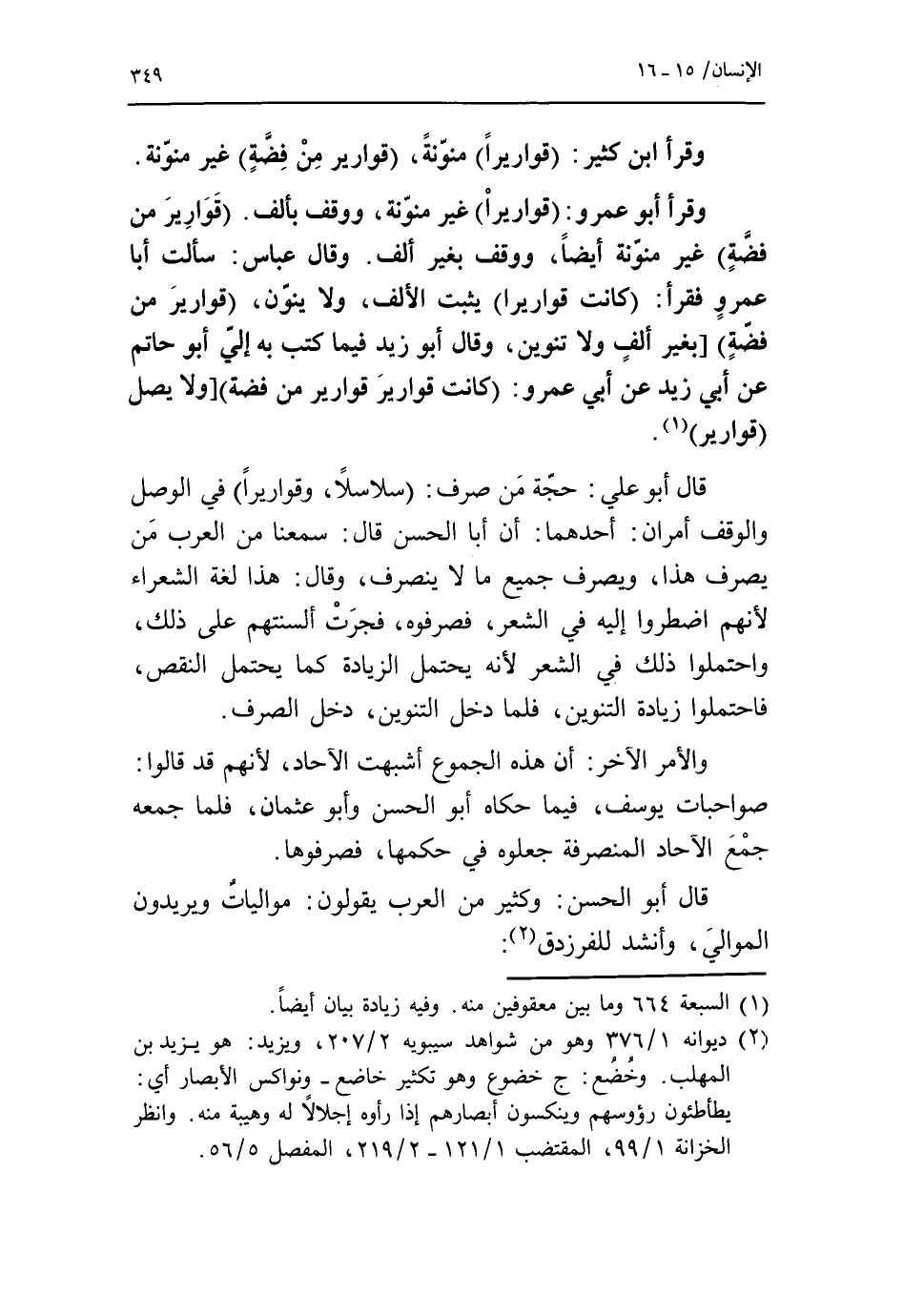 وقرأ أبو عمرو: قواريرا غير منونة، ووقف بألف. قوارير من فضة غير منوّنة أيضا، ووقف بغير ألف. وقال عباس: سألت أبا عمرو فقرأ: كانت قواريرا يثبت الألف، ولا ينوّن، قوارير من فضة [بغير ألف ولا تنوين، وقال أبو زيد فيما كتب به إلي أبو حاتم عن أبي زيد عن أبي عمرو: كانت قوارير من فضة [ولا يصل قوارير «1».