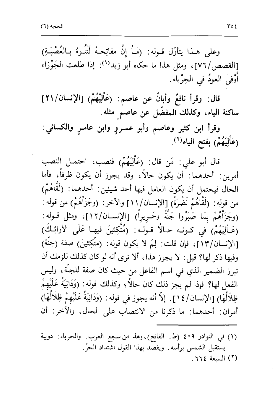 قال: وقرأ نافع وأبان عن عاصم: عاليهم [الإنسان/ 21] ساكنة الياء، وكذلك المفضّل عن عاصم مثله.