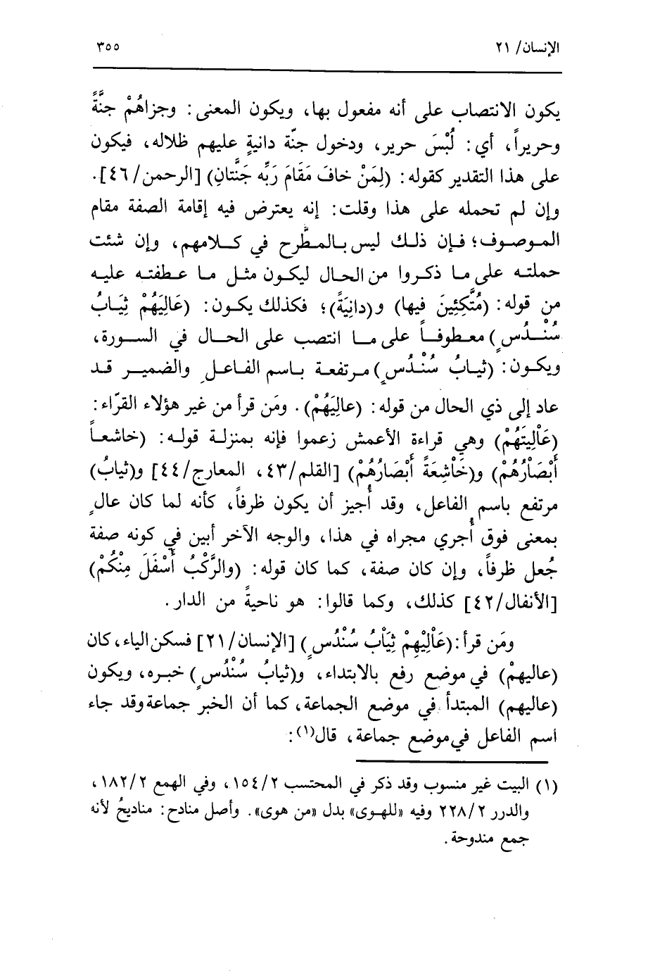وإن لم تحمله على هذا وقلت: إنه يعترض فيه إقامة الصفة مقام الموصوف، فإن ذلك ليس بالمطرح في كلامهم، وإن شئت حملته على ما ذكروا من الحال ليكون مثل ما عطفته عليه من قوله: متكئين فيها ودانية، فكذلك يكون: عاليهم ثياب سندس معطوفا على ما انتصب على الحال في السورة، ويكون: ثياب سندس مرتفعة باسم الفاعل والضمير قد عاد إلى ذي الحال من قوله: عاليهم. ومن قرأ من غير هؤلاء القرّاء: