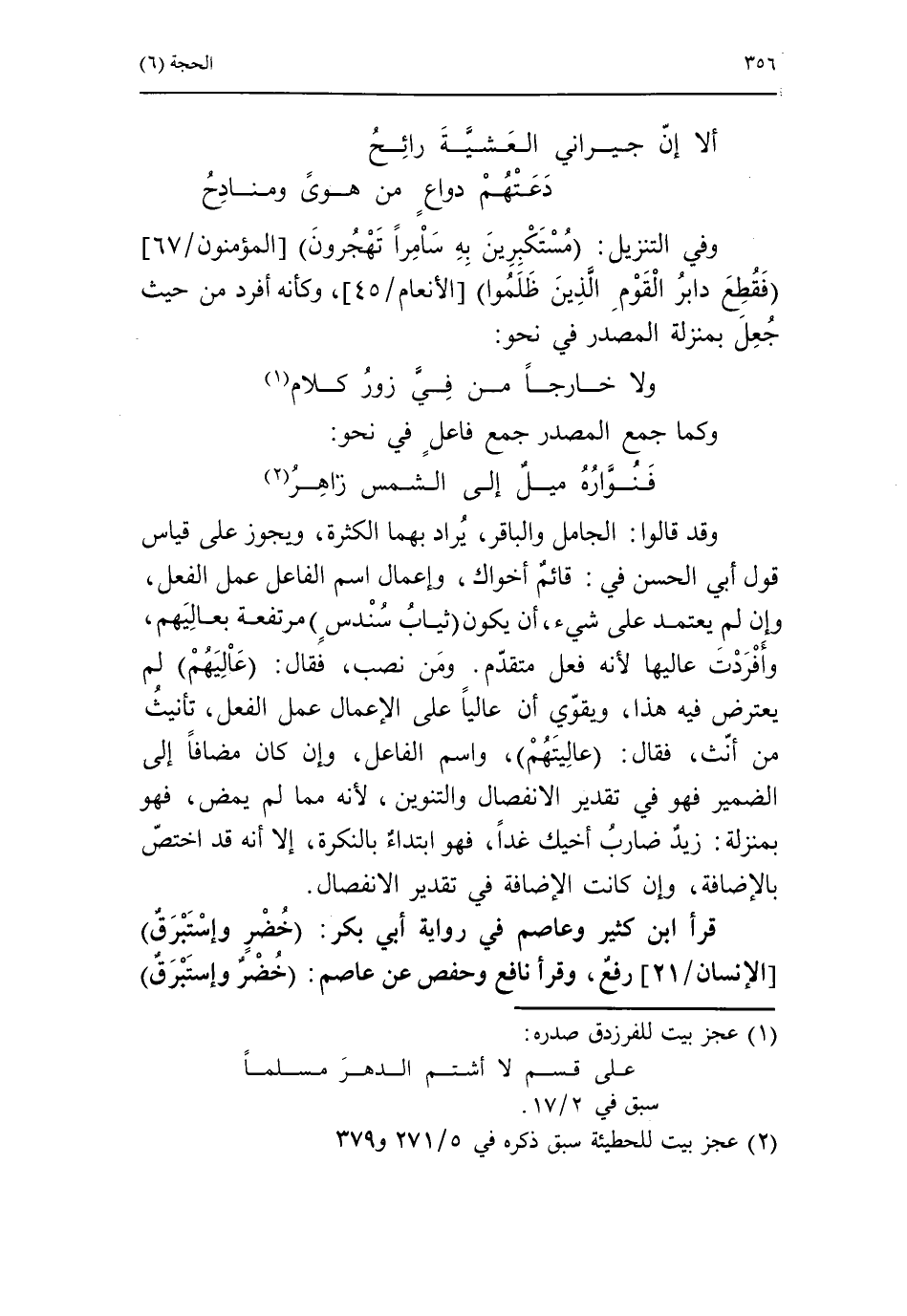 قرأ ابن كثير وعاصم في رواية أبي بكر: خضر وإستبرق [الإنسان/ 21] رفع، وقرأ نافع وحفص عن عاصم: خضر وإستبرق