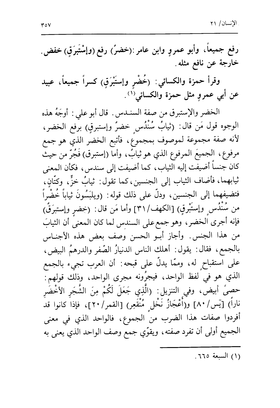 الخضر والإستبرق من صفة السندس. قال أبو علي: أوجه هذه الوجوه قول من قال: ثياب سندس خضر واستبرق برفع الخضر، لأنه صفة مجموعة لموصوف بمجموع، فأتبع الخضر الذي هو جمع مرفوع، الجميع المرفوع الذي هو ثياب، وأما إستبرق فجرّ من حيث كان جنسا أضيفت إليه الثياب، كما أضيفت إلى سندس، فكأن المعنى ثيابهما، فأضاف الثياب إلى الجنسين، كما تقول: ثياب خزّ، وكتّان، فتضيفهما إلى الجنسين، ودلّ على ذلك قوله: ويلبسون ثيابا خضرا من سندس وإستبرق [الكهف/ 31] وأما من قال: خضر وإستبرق فإنه أجرى الخضر، وهو جمع على السندس لما كان المعنى أن الثياب من هذا الجنس. وأجاز أبو الحسن وصف بعض هذه الأجناس بالجمع، فقال: يقول: أهلك الناس الدينار الصّفر والدرهم البيض، على استقباح له، وممّا يدلّ على قبحه: أن العرب تجيء بالجمع الذي هو في لفظ الواحد، فيجرونه مجرى الواحد، وذلك قولهم: