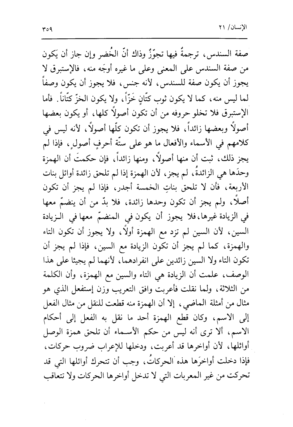 صفة السندس، ترجمة فيها تجوّز وذاك أن الخضر وإن جاز أن يكون من صفة السندس على المعنى وعلى ما غيره أوجه منه، فالإستبرق لا يجوز أن يكون صفة للسندس، لأنه جنس، فلا يجوز أن يكون وصفا لما ليس منه، كما لا يكون ثوب كتّان خزّا، ولا يكون الخزّ كتّانا. فأما الإستبرق فلا تخلو حروفه من أن تكون أصولا كلها، أو يكون بعضها أصولا وبعضها زائدا، فلا يجوز أن تكون كلّها أصولا، لأنه ليس في كلامهم في الأسماء والأفعال ما هو على ستّة أحرف أصول، فإذا لم يجز ذلك، ثبت أن منها أصولا، ومنها زائدا، فإن حكمت أن الهمزة وحدها هي الزائدة، لم يجز، لأن الهمزة إذا لم تلحق زائدة أوائل بنات الأربعة، فأن لا تلحق بنات الخمسة أجدر، فإذا لم يجز أن تكون أصلا، ولم يجز أن تكون وحدها زائدة، فلا بدّ من أن ينضمّ معها في الزيادة غيرها، فلا يجوز أن يكون في المنضمّ معها في الزيادة السين، لأن السين لم تزد مع الهمزة أولا، ولا يجوز أن تكون التاء والهمزة، كما لم يجز أن تكون الزيادة مع السين، فإذا لم يجز أن تكون التاء ولا السين زائدين على انفرادهما، لأنهما لم يجيئا على هذا الوصف، علمت أن الزيادة هي التاء والسين مع الهمزة، وأن الكلمة من الثلاثة، ولما نقلت فأعربت وافق التعريب وزن استفعل الذي هو مثال من أمثلة الماضي، إلا أن الهمزة منه قطعت للنقل من مثال الفعل إلى الاسم، وكان قطع الهمزة أحد ما نقل به الفعل إلى أحكام الاسم، ألا ترى أنه ليس من حكم الأسماء أن تلحق همزة الوصل أوائلها، لأن أواخرها قد أعربت، ودخلها للإعراب ضروب حركات، فإذا دخلت أواخرها هذه الحركات، وجب أن تتحرك أوائلها التي قد تحركت من غير المعربات التي لا تدخل أواخرها الحركات ولا تتعاقب