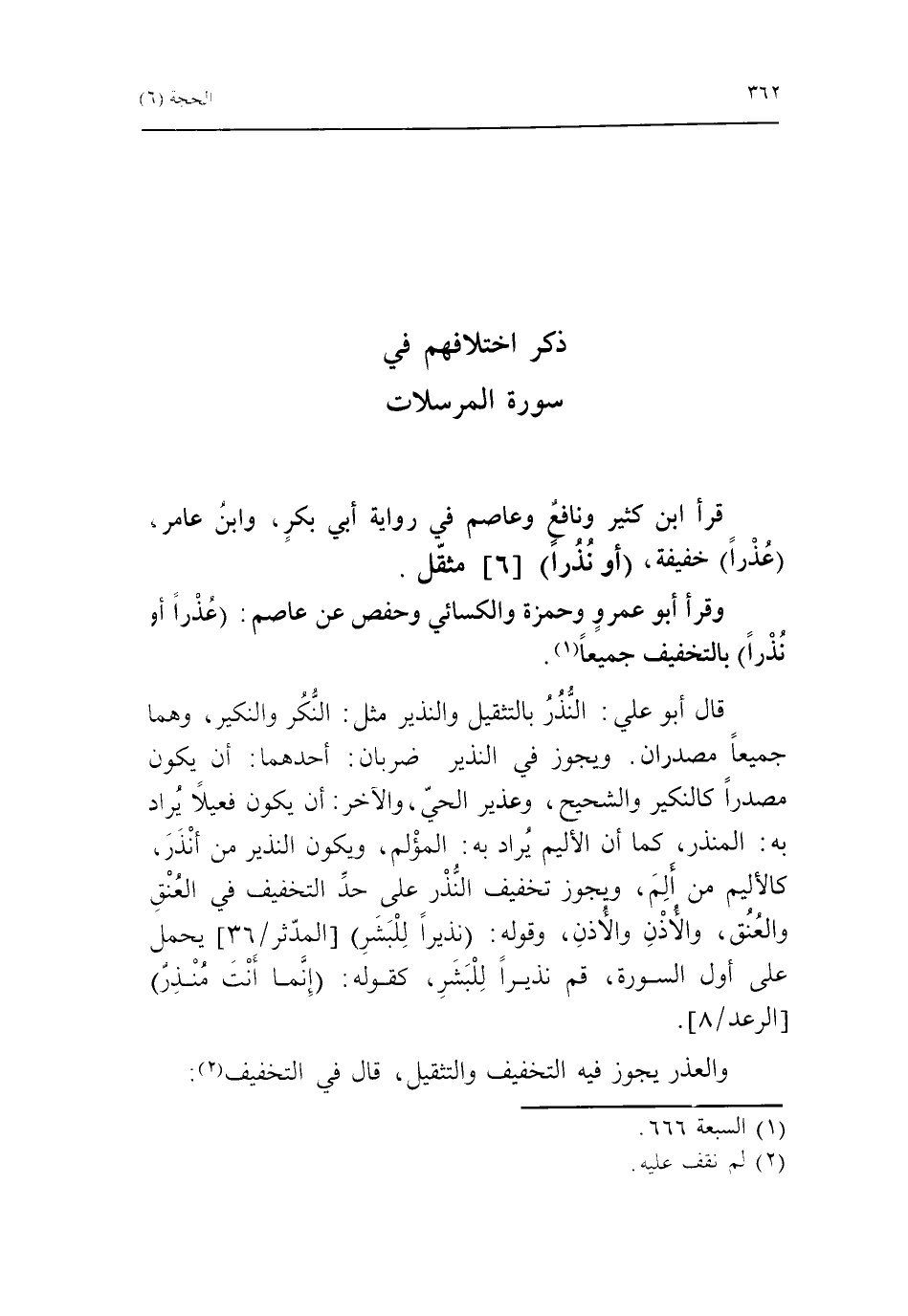 قرأ ابن كثير ونافع وعاصم في رواية أبي بكر، وابن عامر، عذرا خفيفة، أو نذرا [6] مثقّل.
