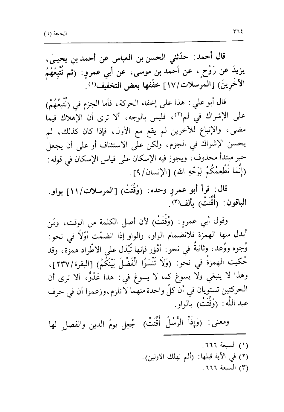 قال أحمد: حدّثني الحسن بن العباس عن أحمد بن يحيى، يزيد عن روح، عن أحمد بن موسى، عن أبي عمرو: ثم نتبعهم الآخرين [المرسلات/ 17] خفّفها بعض التخفيف «1».