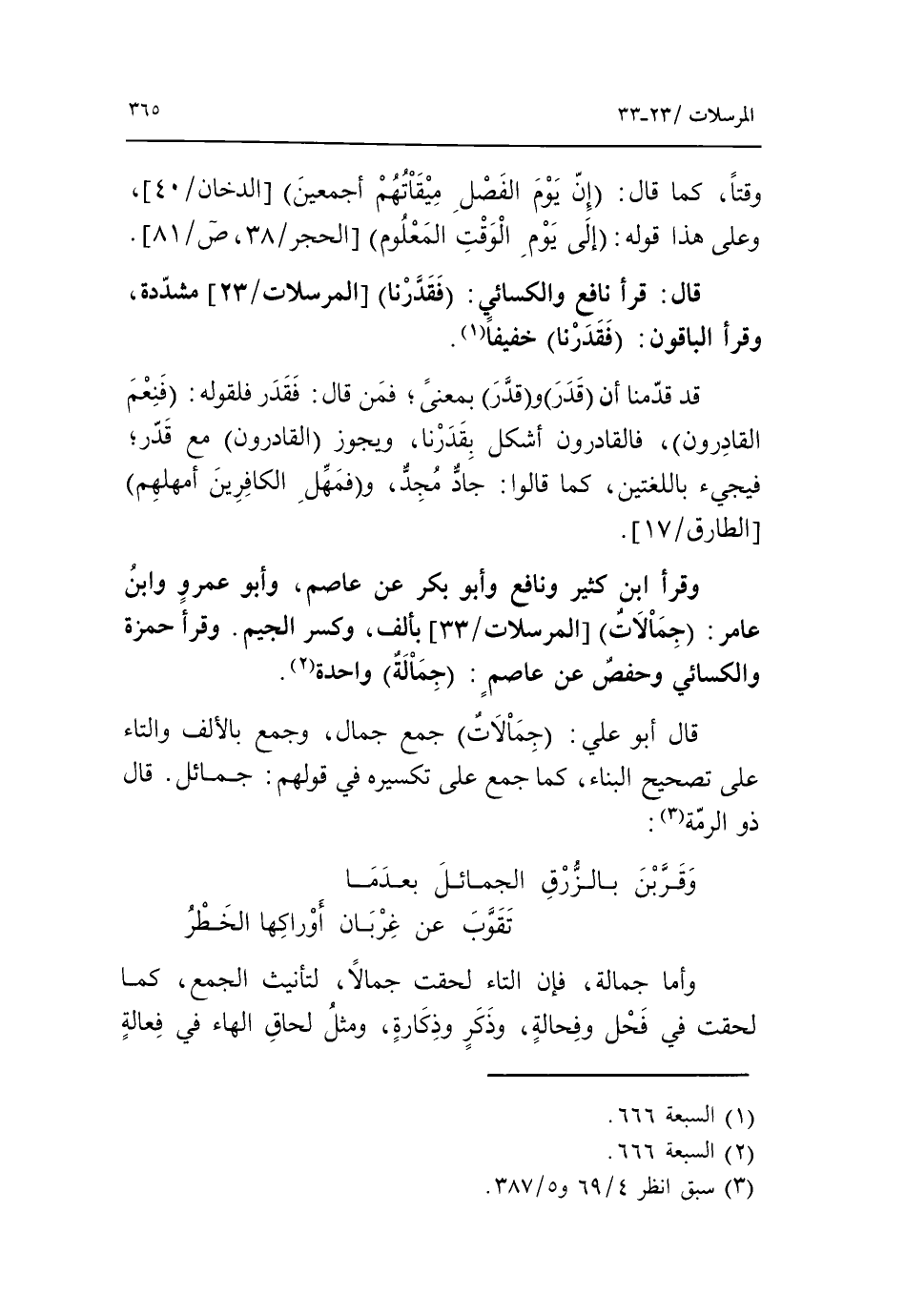 وقرأ ابن كثير ونافع وأبو بكر عن عاصم، وأبو عمرو وابن عامر: جمالات [المرسلات/ 33] بألف، وكسر الجيم. وقرأ حمزة والكسائي وحفص عن عاصم: جمالة واحدة «2».