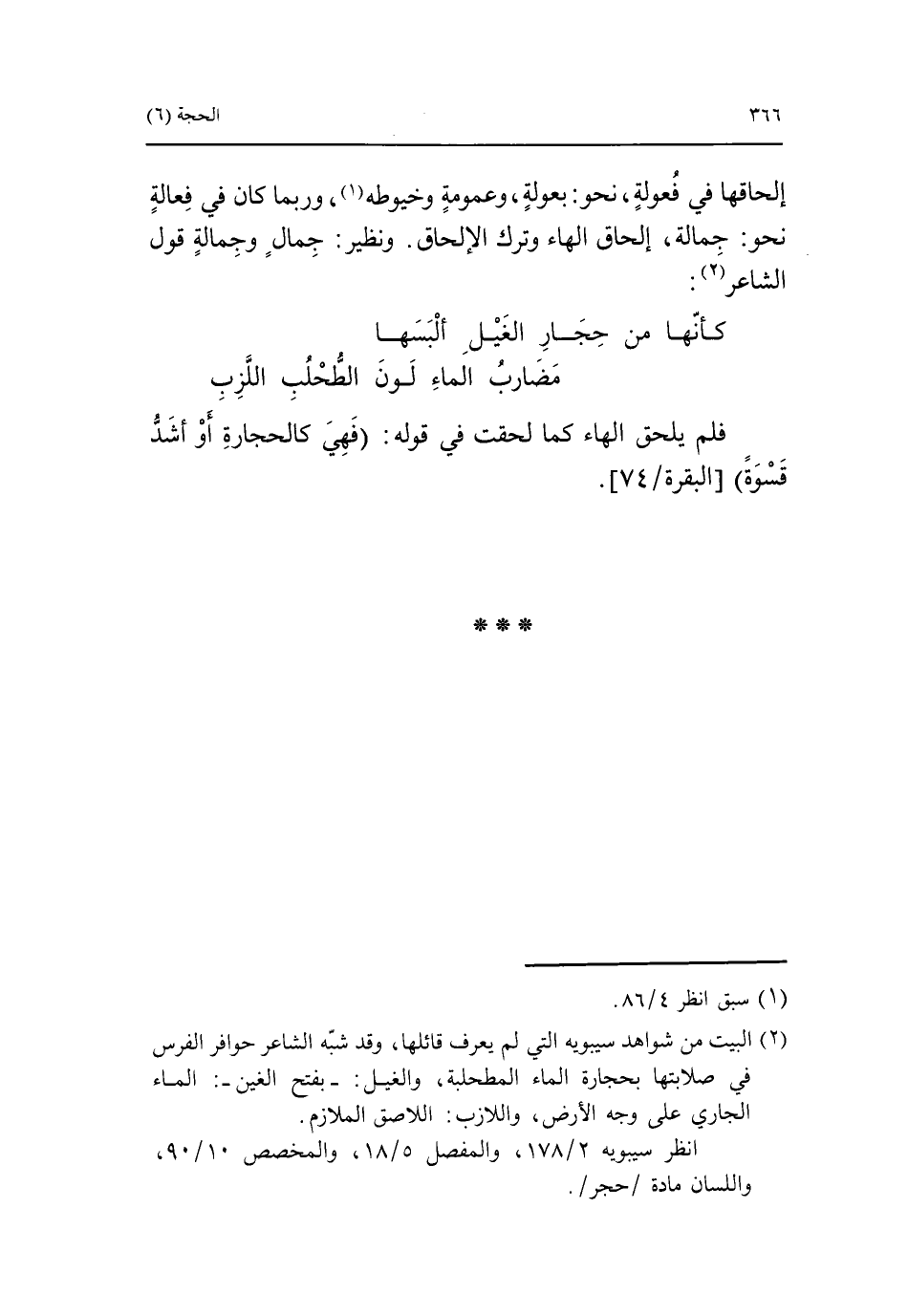 إلحاقها في فعولة، نحو: بعولة، وعمومة وخيوطة «1»، وربما كان في فعالة نحو: جمالة، إلحاق الهاء وترك الإلحاق. ونظير: جمال وجمالة قول الشاعر «2»: