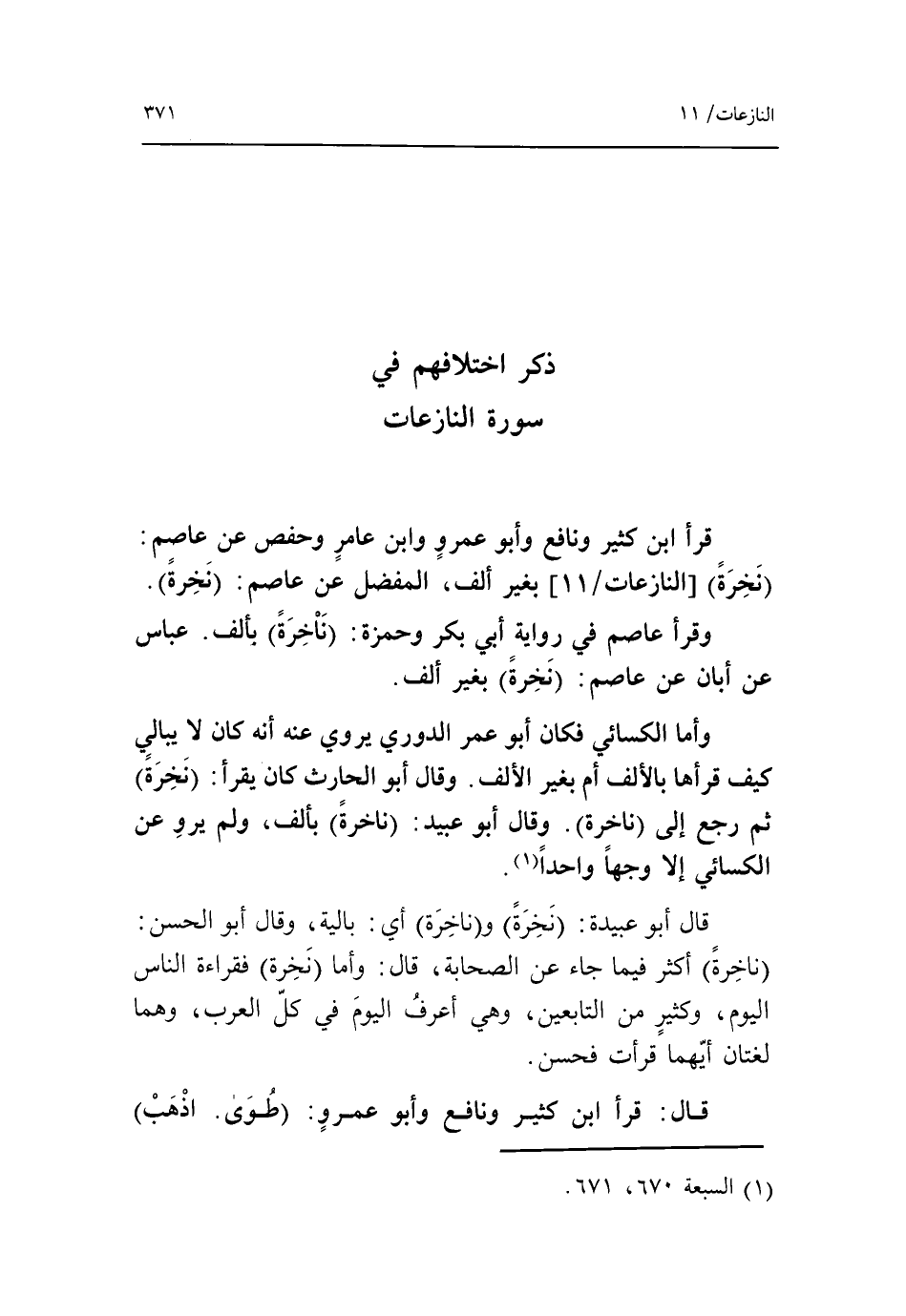 ناخرة أكثر فيما جاء عن الصحابة، قال: وأما نخرة فقراءة الناس اليوم، وكثير من التابعين، وهي أعرف اليوم في كلّ العرب، وهما لغتان أيّهما قرأت فحسن.