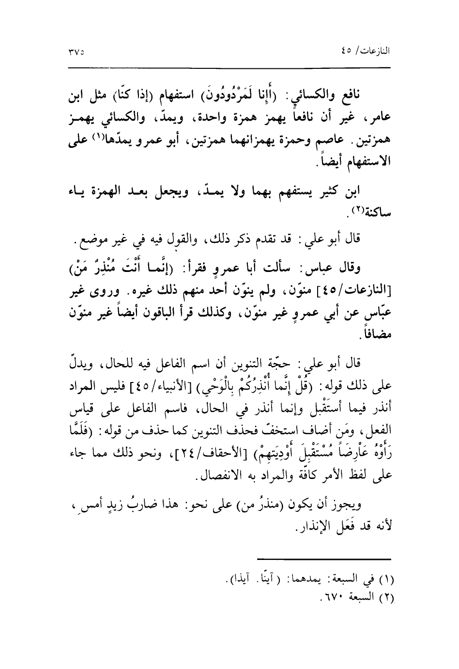 وقال عباس: سألت أبا عمرو فقرأ: إنما أنت منذر من [النازعات/ 45] منوّن ولم ينوّن أحد منهم ذلك غيره. وروى غير عبّاس عن أبي عمرو غير منوّن، وكذلك قرأ الباقون أيضا غير منوّن مضافا.