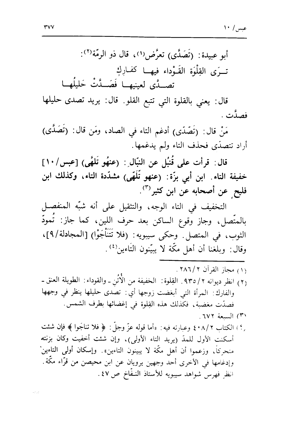 (4) الكتاب 2/ 408 وعبارته فيه: «أما قوله عزّ وجلّ: (فلا تناجوا) فإن شئت أسكنت الأول للمدّ (يريد التاء الأولى)، وإن شئت أخفيت وكان بزنته متحركا، وزعموا أن أهل مكّة لا يبينون التاءين». وإسكان أولى التاءين وإدغامها في الأخرى أحد وجهين يرويان عن ابن محيصن من قرّاء مكّة.