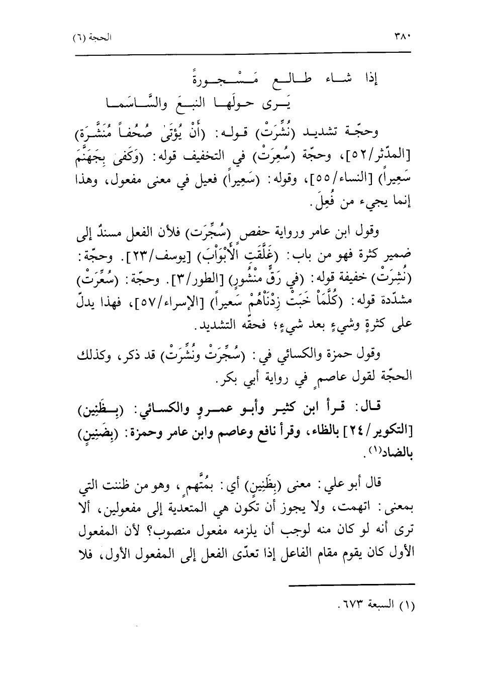 إذا شاء طالع مسجورة يرى حولها النبع والسّاسما وحجّة تشديد نشرت قوله: أن يؤتى صحفا منشرة [المدثر/ 52]، وحجّة سعرت في التخفيف قوله: وكفى بجهنم سعيرا [النساء/ 55]، وقوله: سعيرا فعيل في معنى مفعول، وهذا إنما يجيء من فعل.