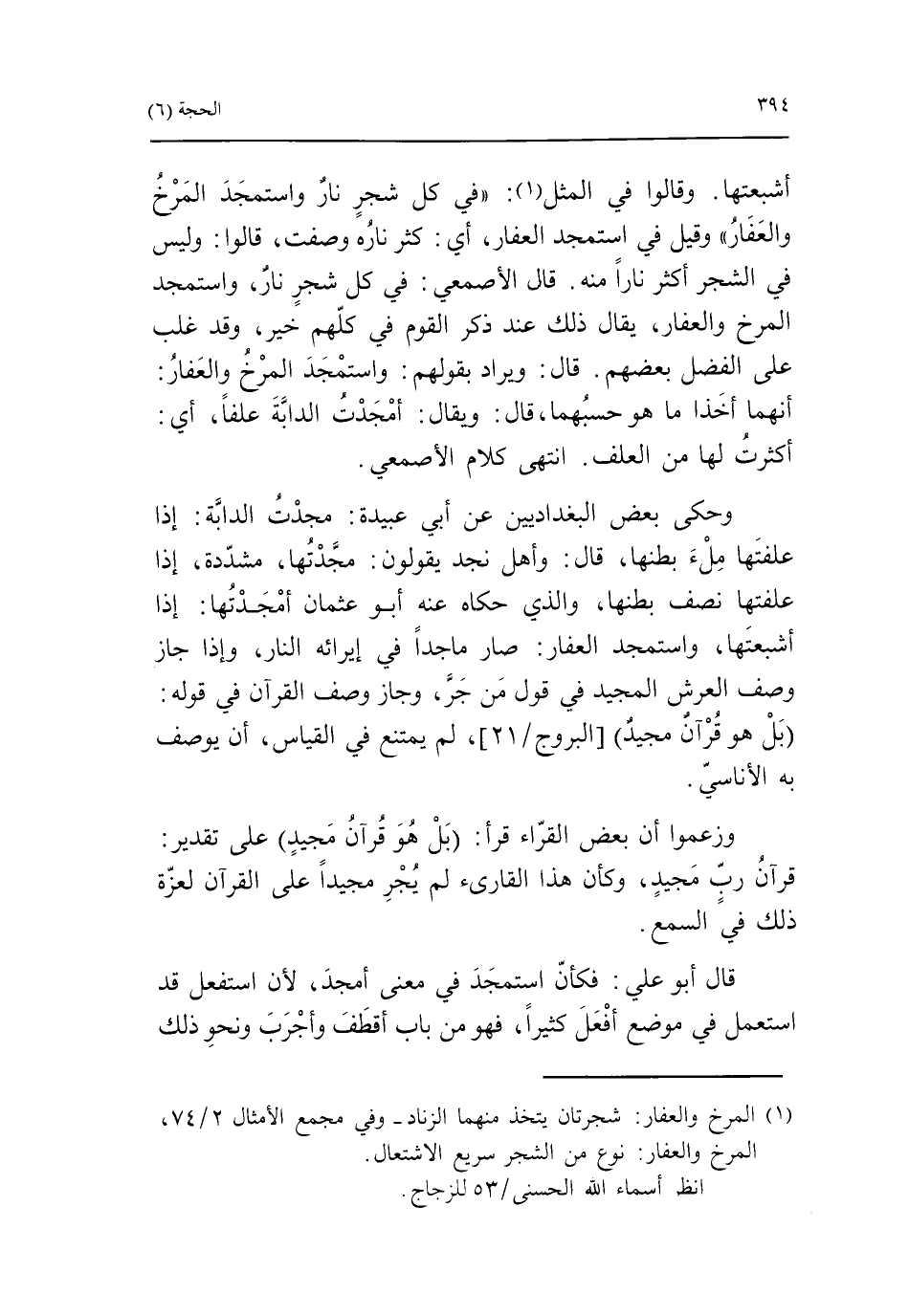 وحكى بعض البغداديين عن أبي عبيدة: مجدت الدابّة: إذا علفتها ملء بطنها، قال: وأهل نجد يقولون: مجدتها، مشدّدة، إذا علفتها نصف بطنها، والذي حكاه عنه أبو عثمان أمجدتها: إذا أشبعتها، واستمجد العفار: صار ماجدا في إيرائه النار، وإذا جاز وصف العرش المجيد في قول من جرّ، وجاز وصف القرآن في قوله: