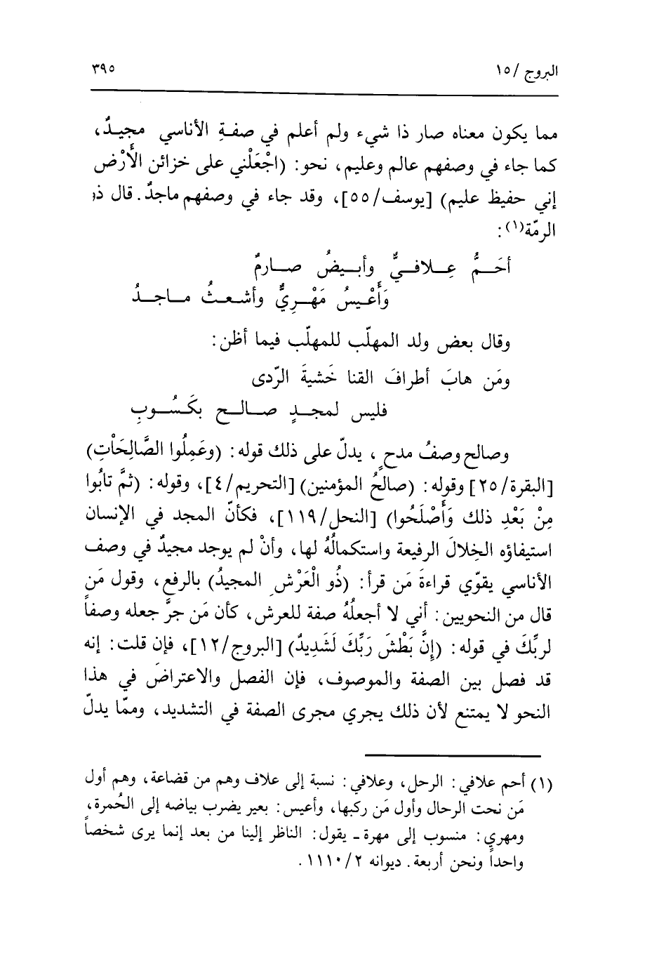 ومن هاب أطراف القنا خشية الردى فليس لمجد صالح بكسوب وصالح وصف مدح، يدلّ على ذلك قوله: وعملوا الصالحات [البقرة/ 25] وقوله: صالح المؤمنين [التحريم/ 4]، وقوله: ثم تابوا من بعد ذلك وأصلحوا [النحل/ 119]، فكأنّ المجد في الإنسان استيفاؤه الخلال الرفيعة واستكماله لها، وأن لم يوجد مجيد في وصف الأناسي يقوّي قراءة من قرأ: ذو العرش المجيد بالرفع، وقول من قال من النحويين: أني لا أجعله صفة للعرش، كأن من جرّ جعله وصفا لربّك في قوله: إن بطش ربك لشديد [البروج/ 12]، فإن قلت: إنه قد فصل بين الصفة والموصوف، فإن الفصل والاعتراض في هذا النحو لا يمتنع لأن ذلك يجري مجرى الصفة في التشديد، وممّا يدلّ
