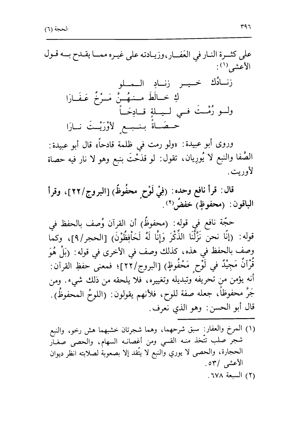 حجّة نافع في قوله: محفوظ أنّ القرآن وصف بالحفظ في قوله: إنا نحن نزلنا الذكر وإنا له لحافظون [الحجر/ 9]، وكما وصف بالحفظ في هذه، كذلك وصف في الأخرى في قوله: بل هو قرآن مجيد في لوح محفوظ [البروج/ 22]، فمعنى حفظ القرآن: